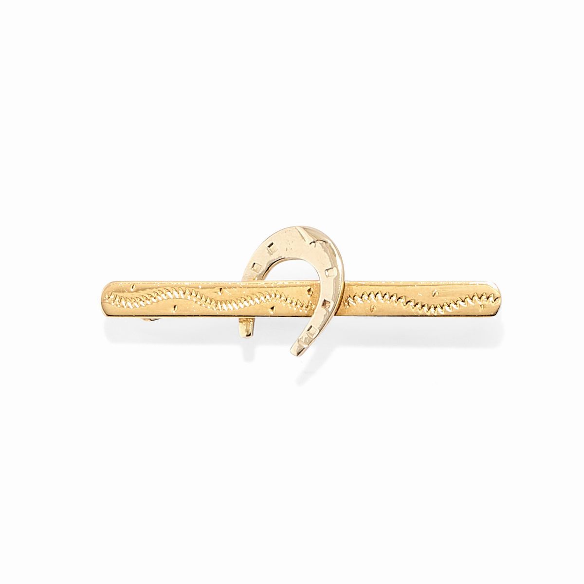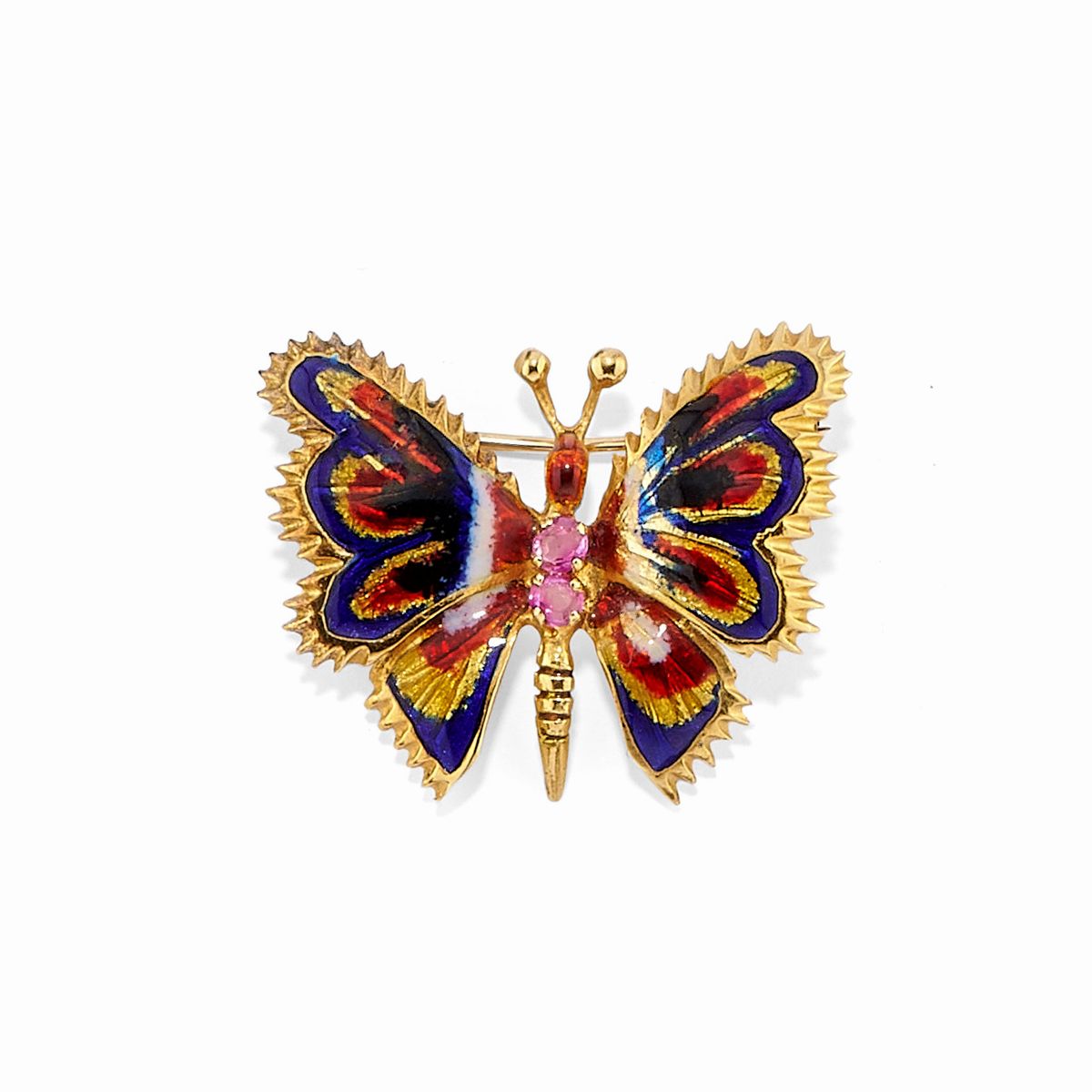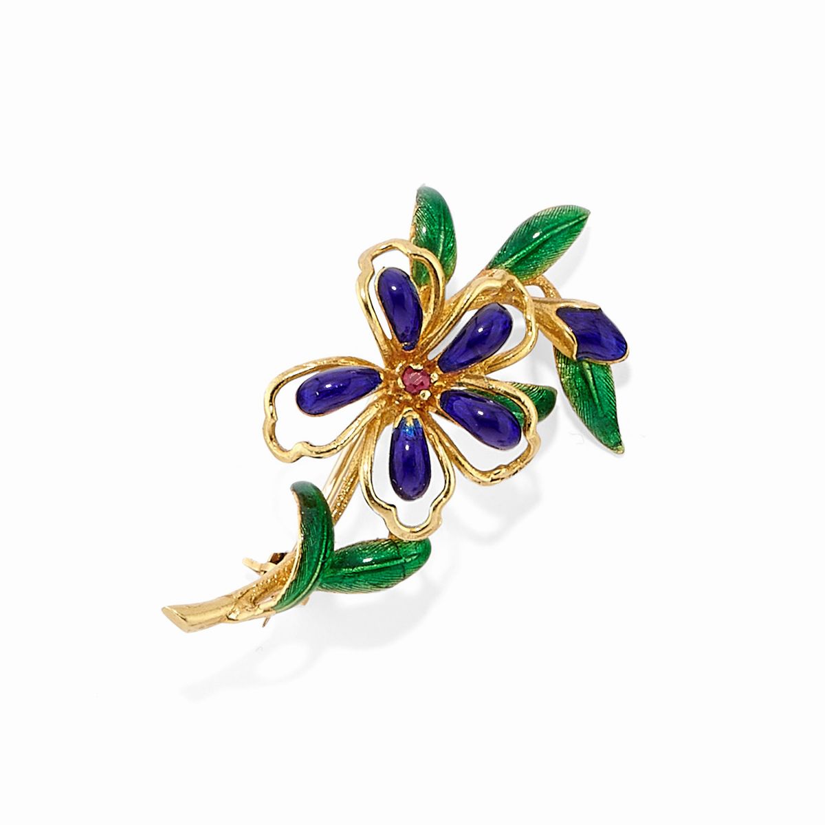 Spilla in oro bicolore 18k, smalto, rubini e diamanti