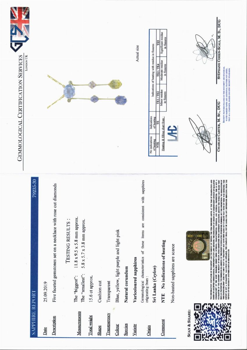 Gli zaffiri che non presentano indicazioni di trattamento termico sono accompagnati da certificato gemmologico numero 79235-30 del 25.09.2019. GCS London