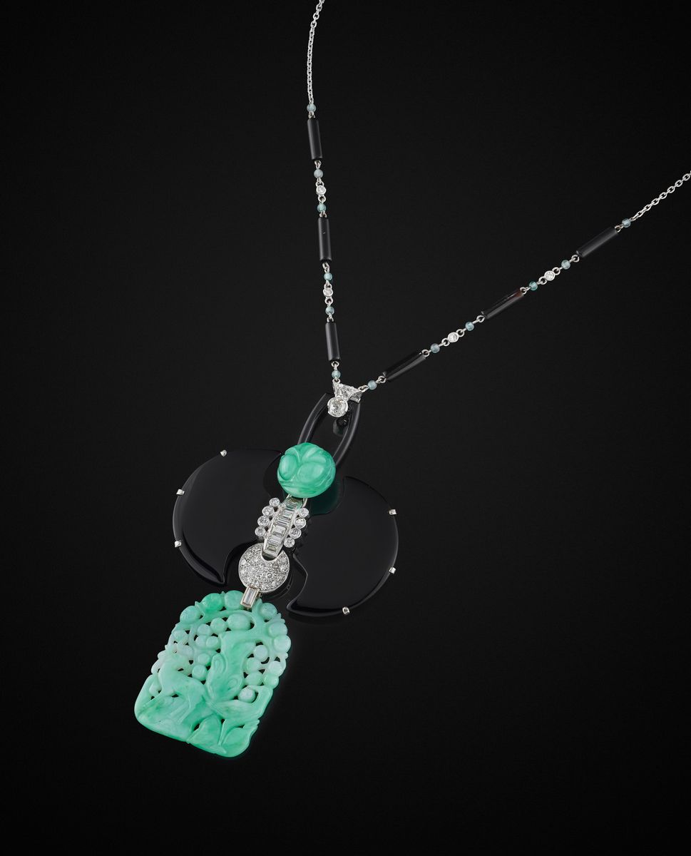 formata da pendente con motivi in onice e giadeiti, impreziosita da diamanti taglio huit-huit, vecchio e baguette, con astuccio.
