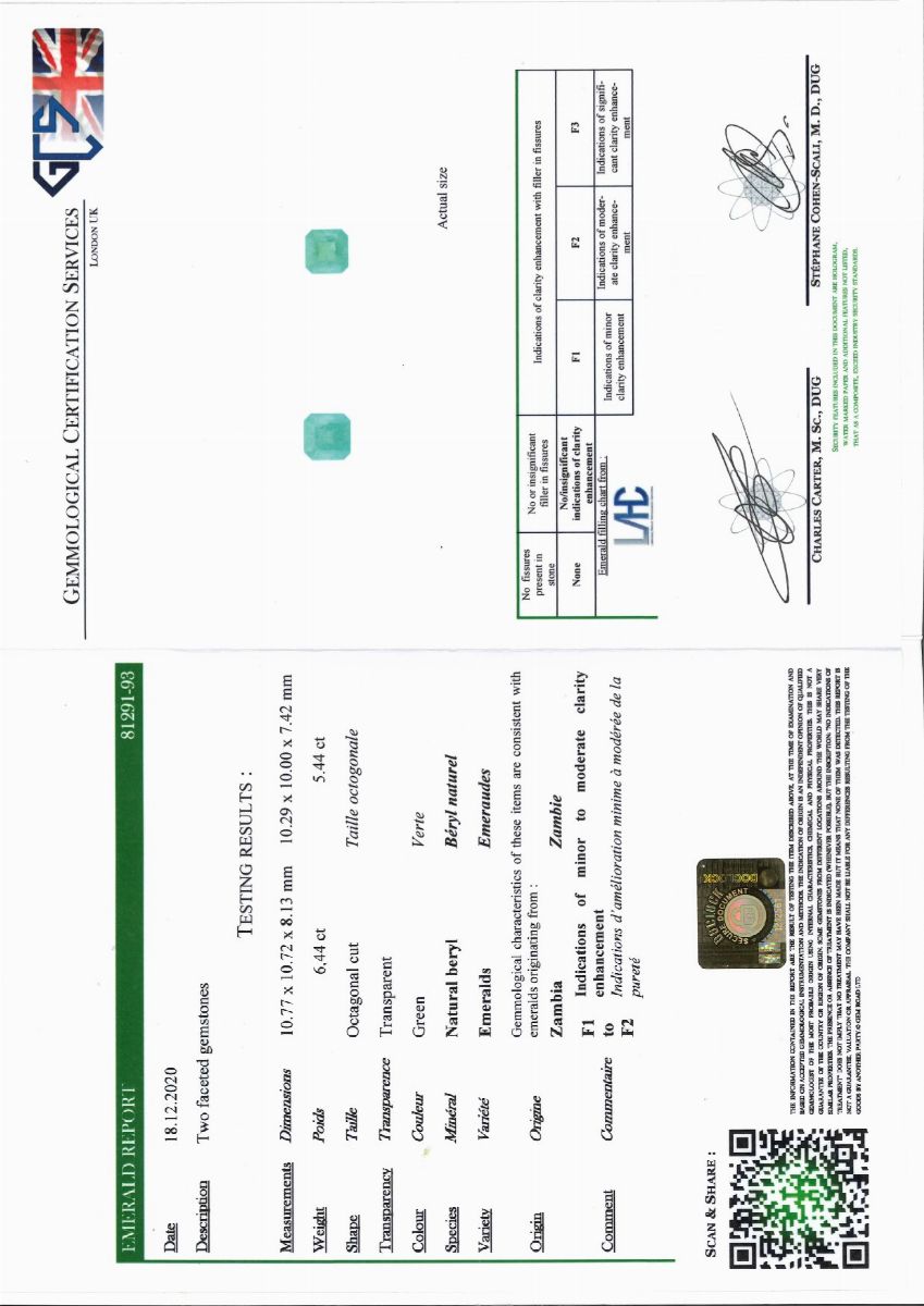 Gli smeraldi che presentano indicazione da minor a moderat clarity sono accompagnati da certificato gemmologico numero 81292-93 del 18.12.2020. GCS London