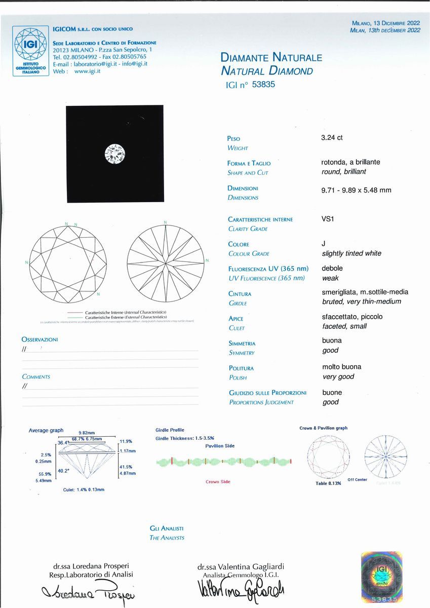 Il diamante è accompagnato da certificato gemmologico n. 53835 del 13.12.2022, IGI Milano