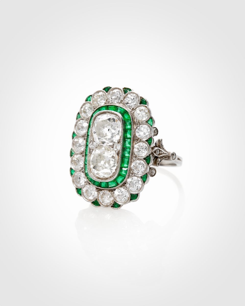 in platinoal centro due diamanti taglio vecchio per totale ct 2,20 circa, colore H/I, purezza VS, contorno in diamanti taglio vecchio per totale ct 2,00 circa, colore H/I, purezza VS/SI e smeraldi taglio baguette e calibré per totale ct 0,50 circa, ai lati diamanti taglio vecchio, rosa e huit-huit per totale ct 0,15 circa.