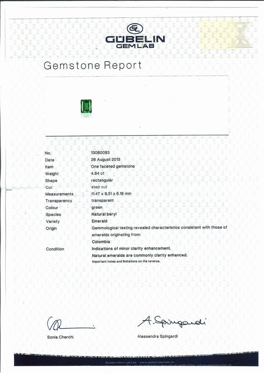 Lo smeraldo che presenta "indication of minor clarity anouncement" è accompagnato da fotocopia del certificato gemmologico n. 13080093 del 26 agosto 2013 Gübelin Gem Lab