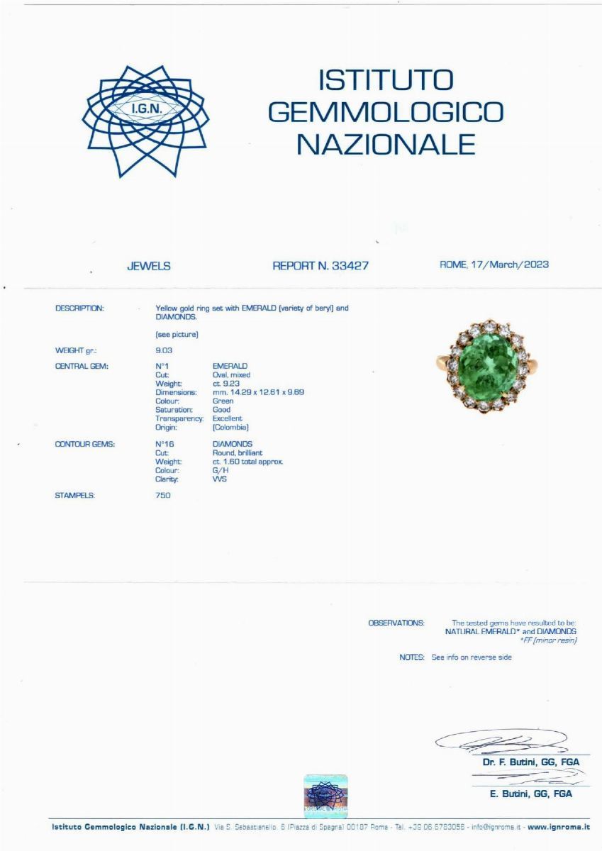 in oro giallo 18kal centro smeraldo Colombia taglio ovale di ct 9,23, contorno in diamanti taglio brillante per totale ct 1,60 circa, colore G/H, purezza VVS.