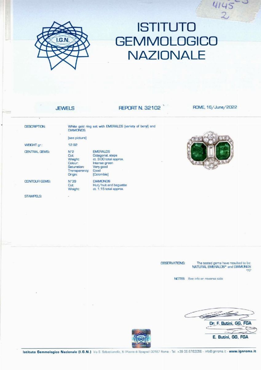 Gli smeraldi sono accompagnati da certificato gemmologico n. 32102 del 16/06/2022, IGN Roma.