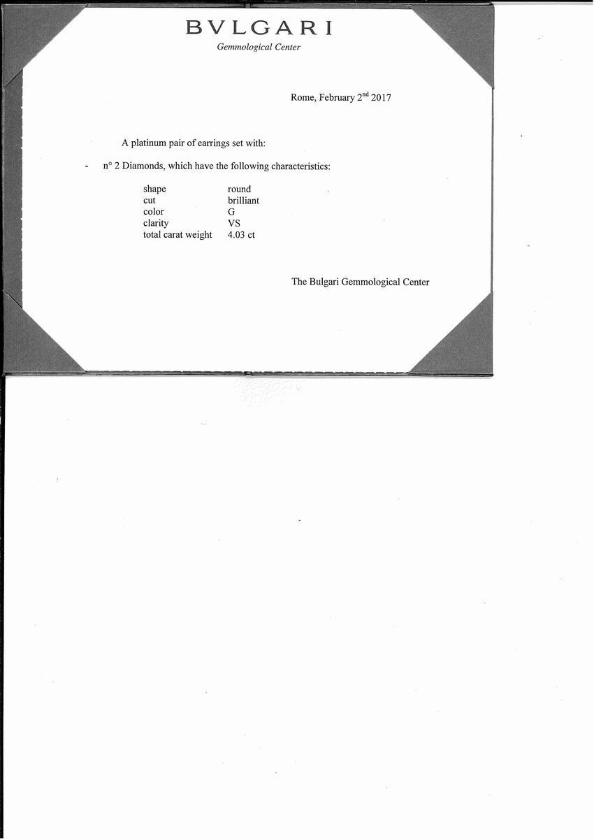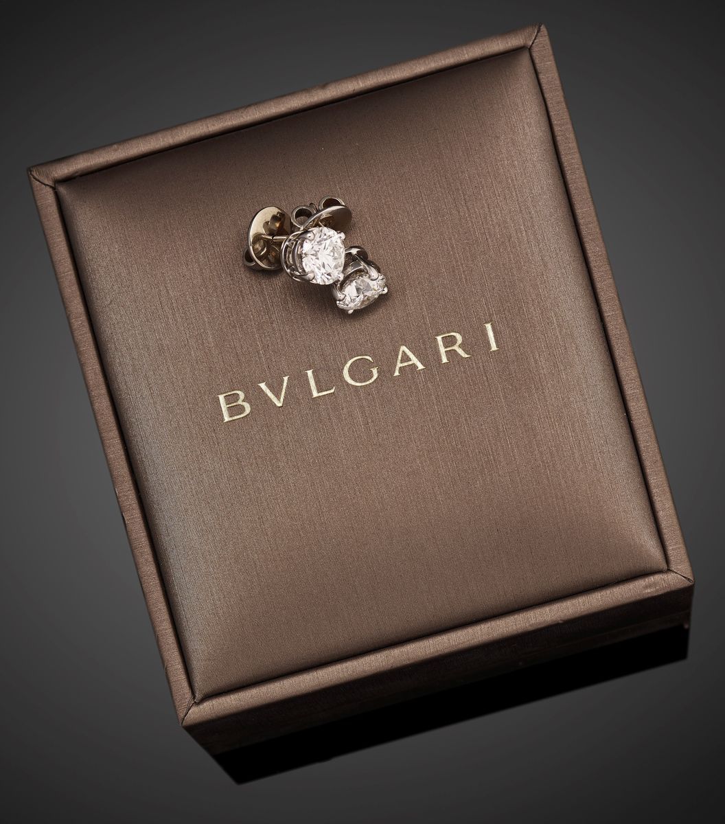 in oro bianco 18k e platinoun diamante taglio brillante di ct 2,00, colore G, purezza VS2 ed un diamante taglio brillante di ct 2,03, colore G, purezza VS2, chiusura perno e farfalla, con astuccio e diamond report di Bulgari.