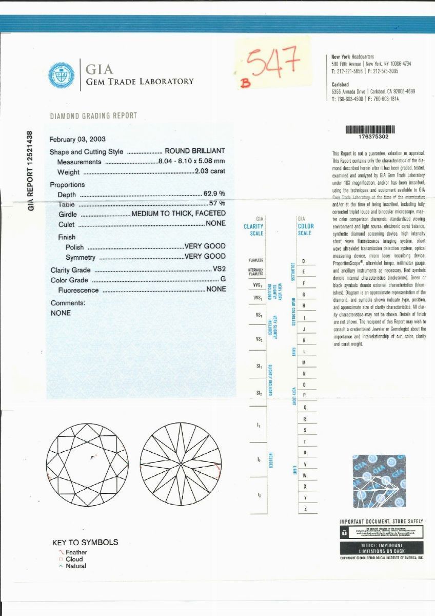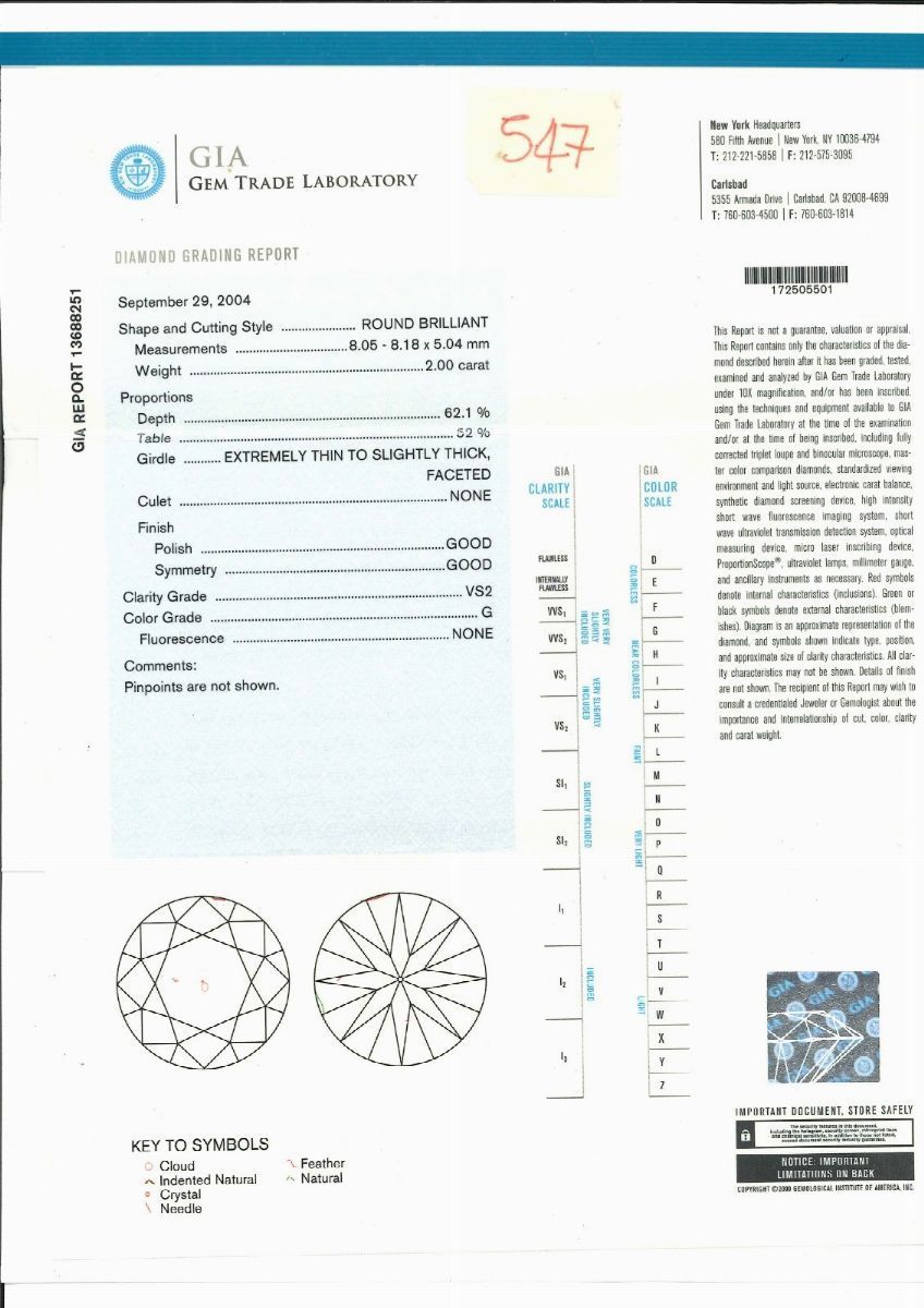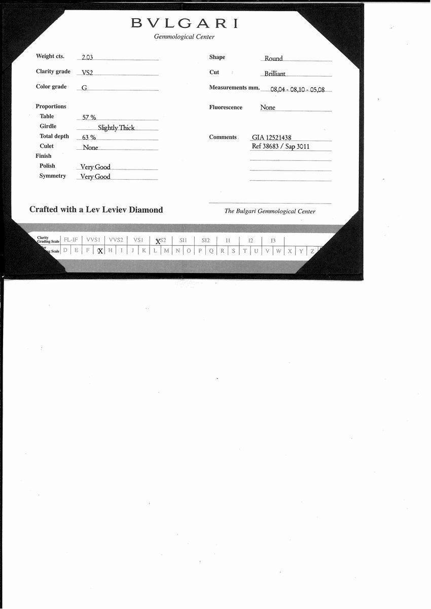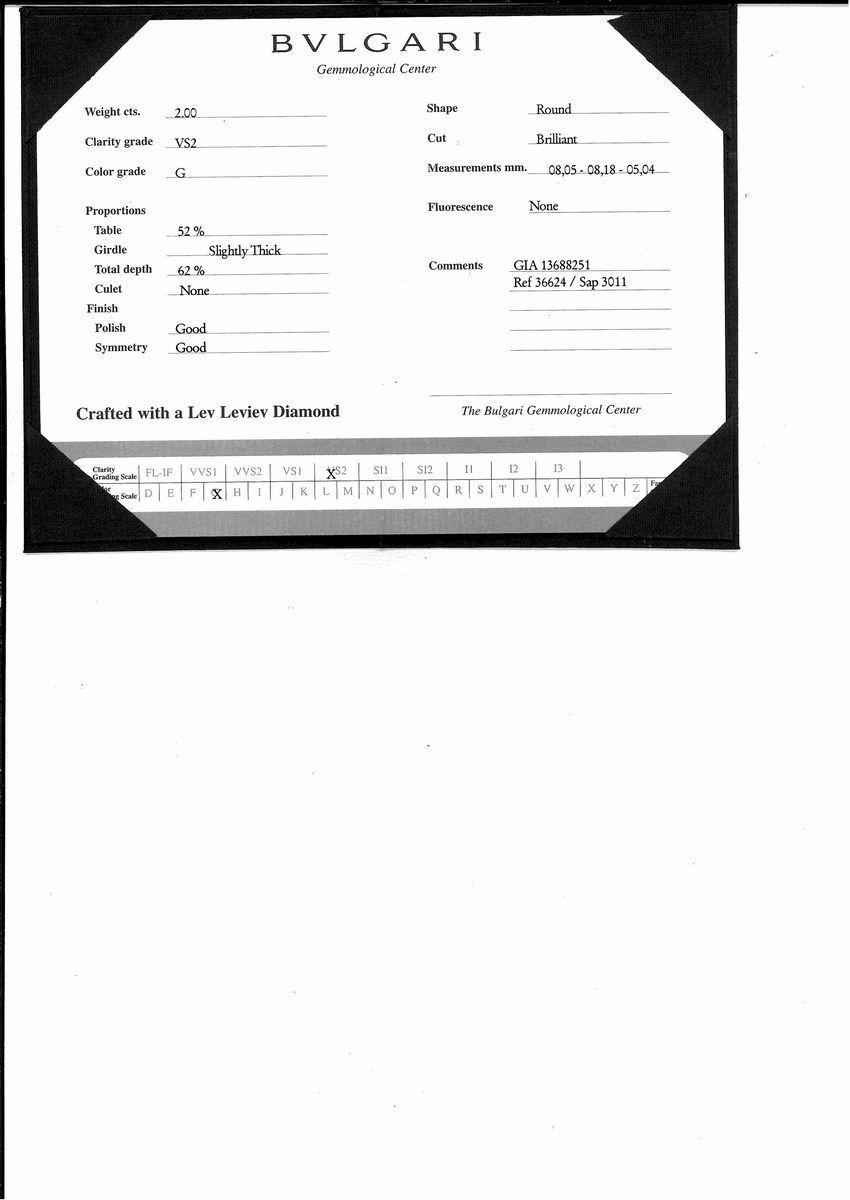 I diamanti sono accompagnati da certificati gemmologici n. 13688251 del 29/09/2004 e n. 12521438 del 03/02/2003, GIA.
