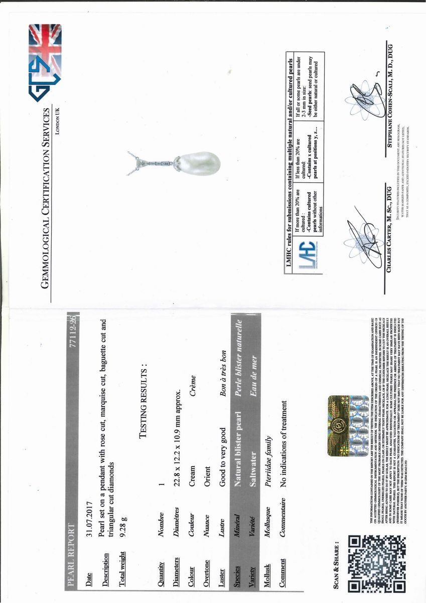 La perla naturale che non presenta trattamenti è accompagnata da certificato n 77112-26 del 31/07/2017 GCS Londra