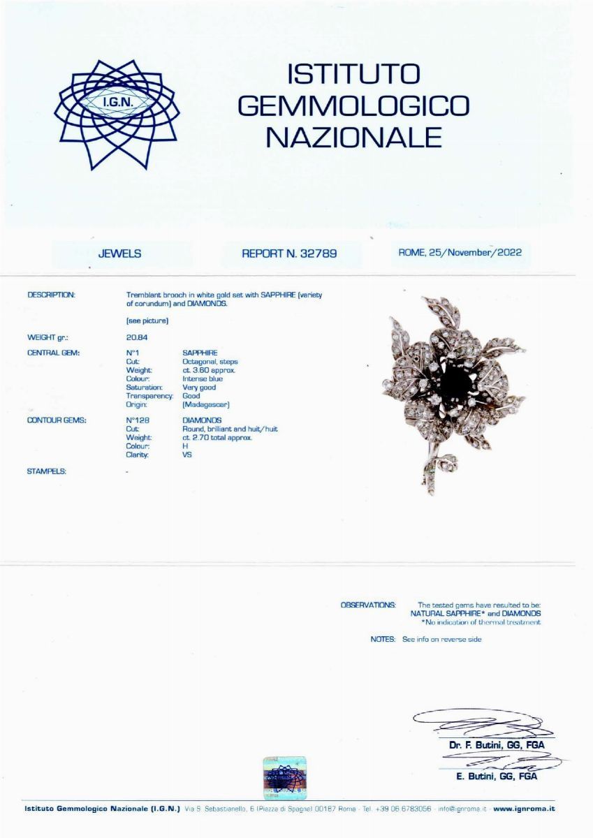 Lo zaffiro, che non presenta indicazioni di trattamento termico, è accompagnato da certificato gemmologico n. 32789 del 25/11/2022, IGN Roma.