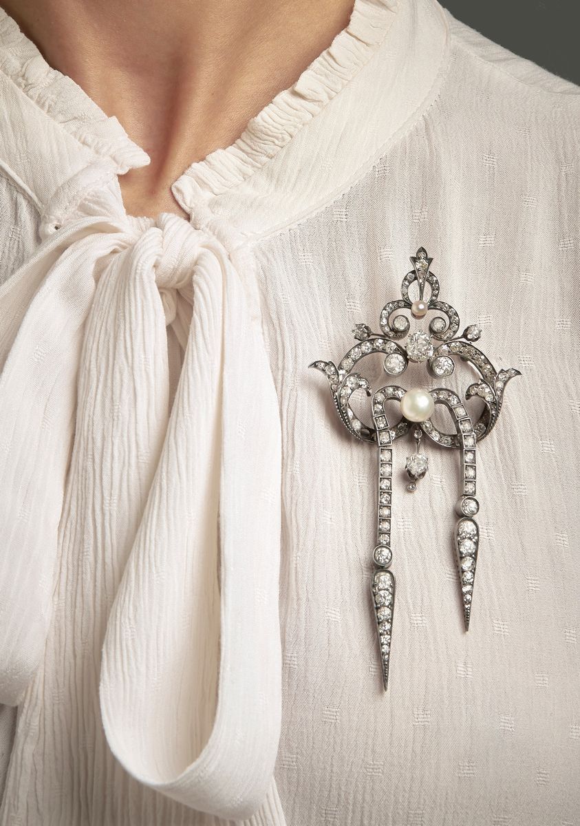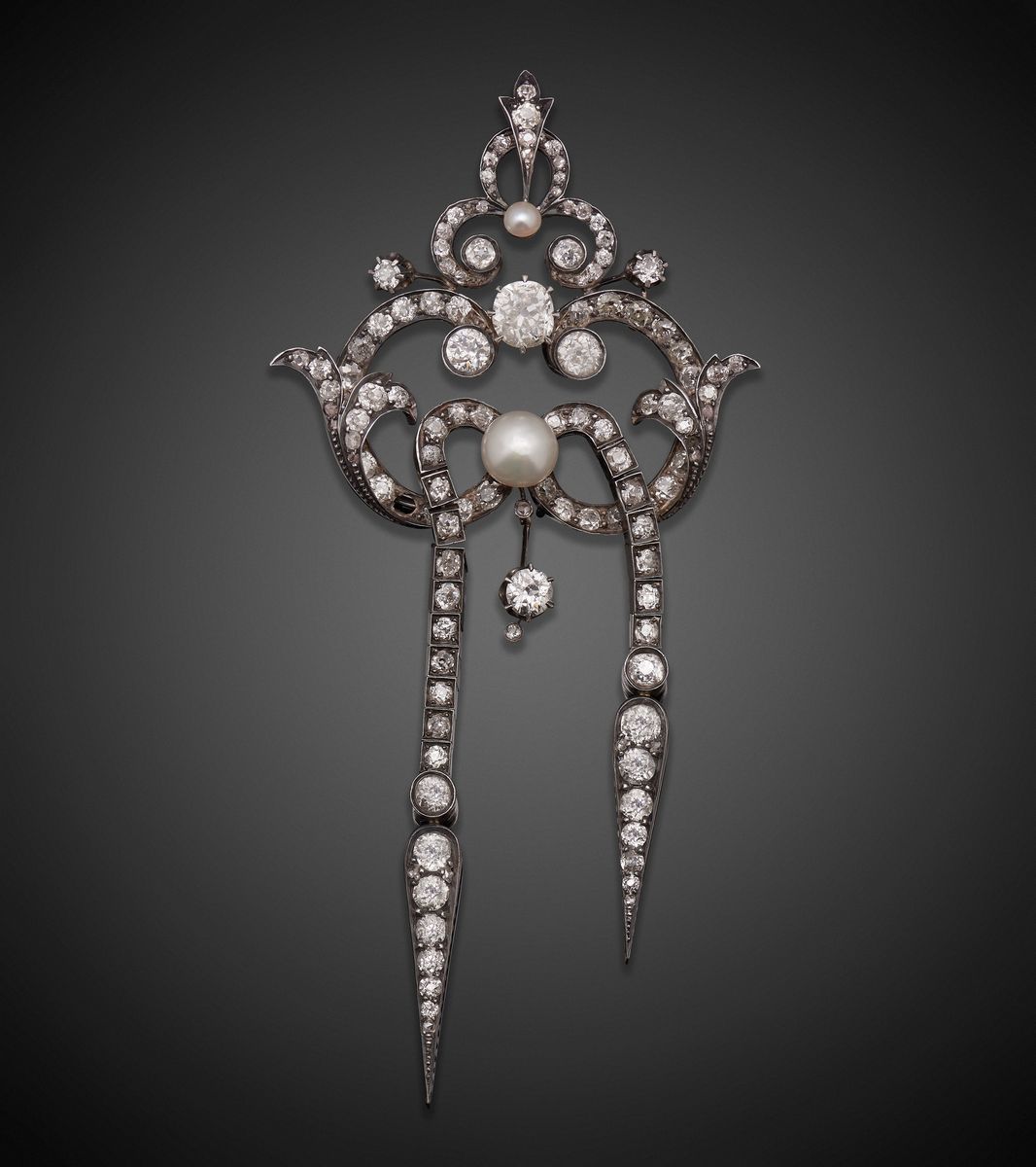 in argento e oro giallo 18kad eleganti volute con due motivi oscillanti a punta, interamente decorata da diamanti taglio vecchio per totale ct 10,00 circa ed al centro due perle (prob. naturali), difetti (un diamante mancante).