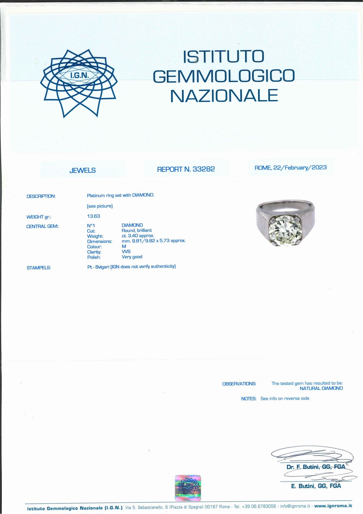 in platinodiamante taglio brillante di ct 3,40 circa, colore M, purezza VVS, reca firma Bulgari.