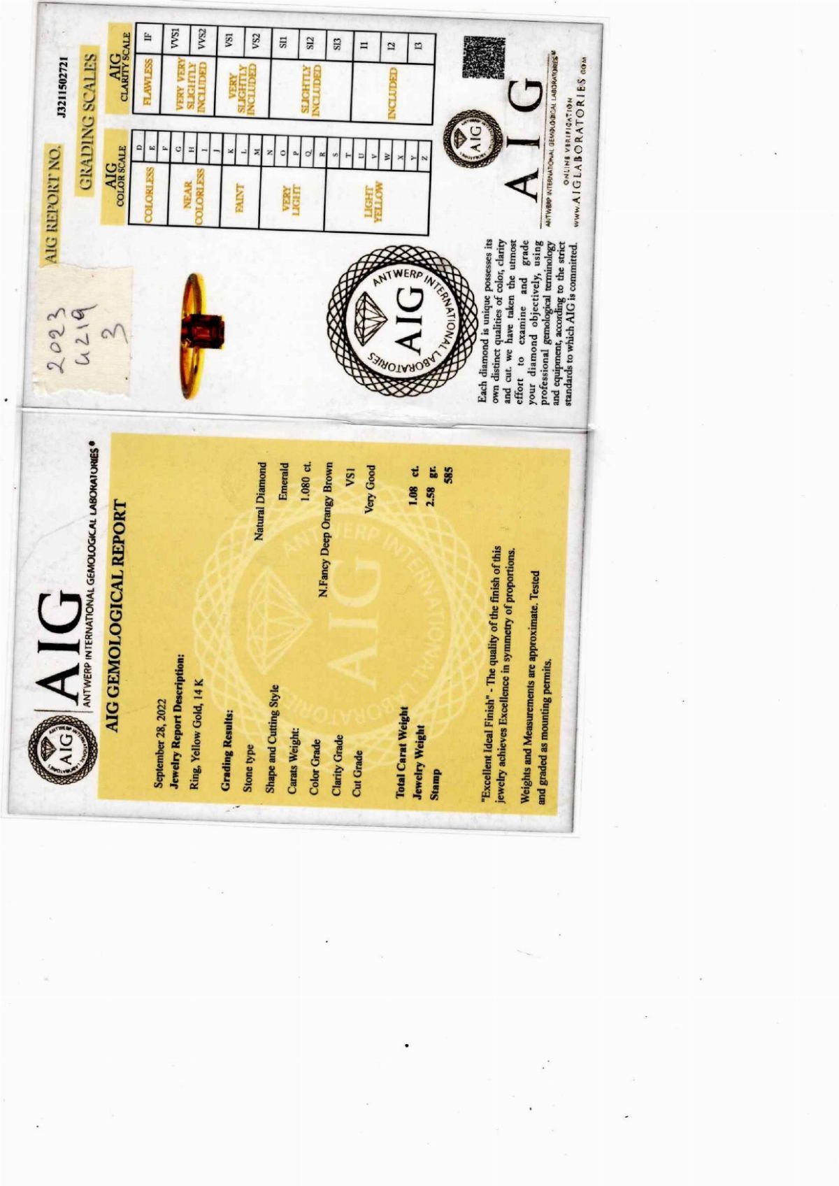 in oro giallo 14kal centro diamante taglio rettangolare a contorno ottagonale di ct 1,080, colore Deep Orangy Brown, purezza VS1.