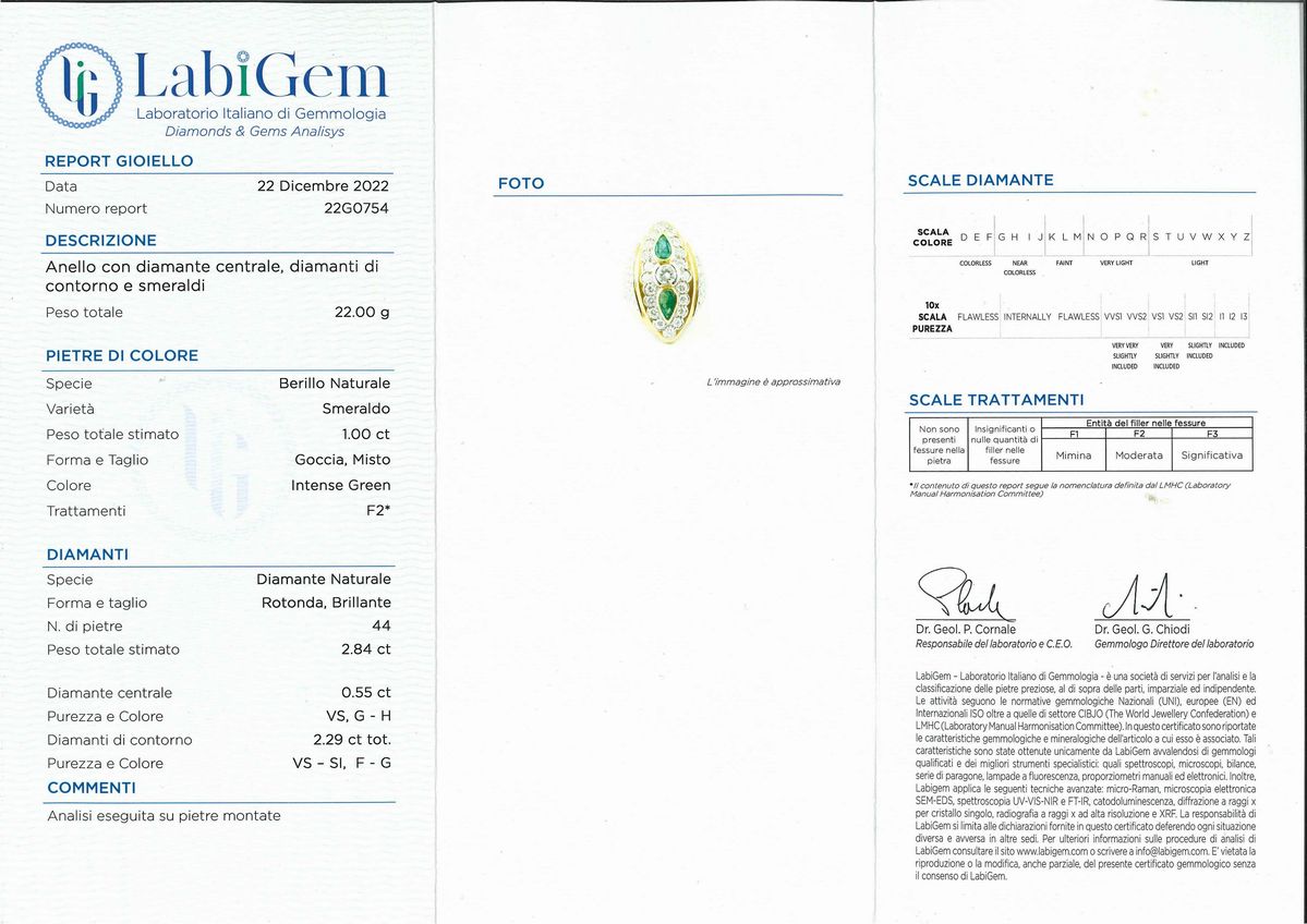 Gli smeraldi e i diamanti sono accompagnati da certificato gemmologico n. 22G0754 del 22/12/2022 Labigem, Vicenza.