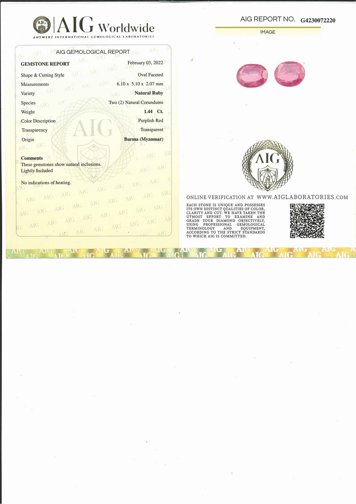 I rubini sono accompagnati da certificato gemmologico n. G4230072220, AIG Milano