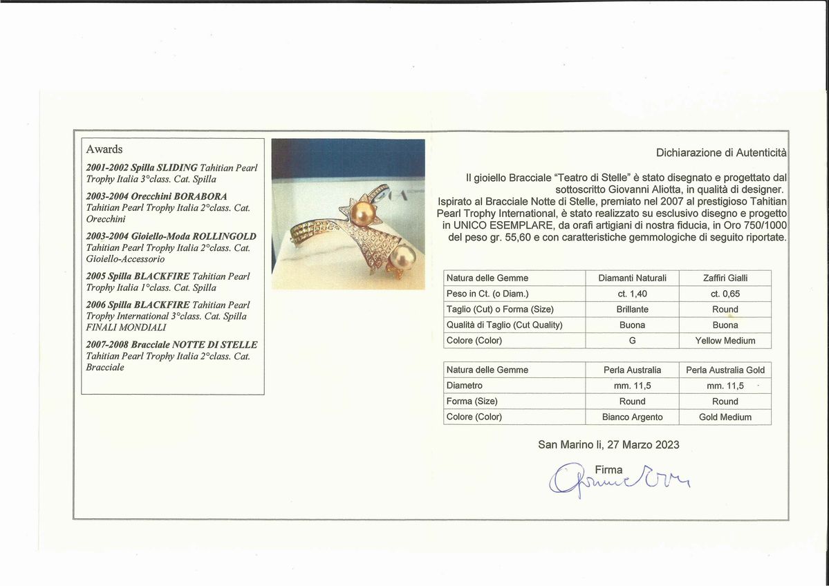 rigido, perle coltivate australiane bianca e golden di mm 11,00/11,50 circa, diamanti taglio brillante per totale ct 1,50 circa e zaffiri gialli taglio rotondo per totale ct 0,70 circa.