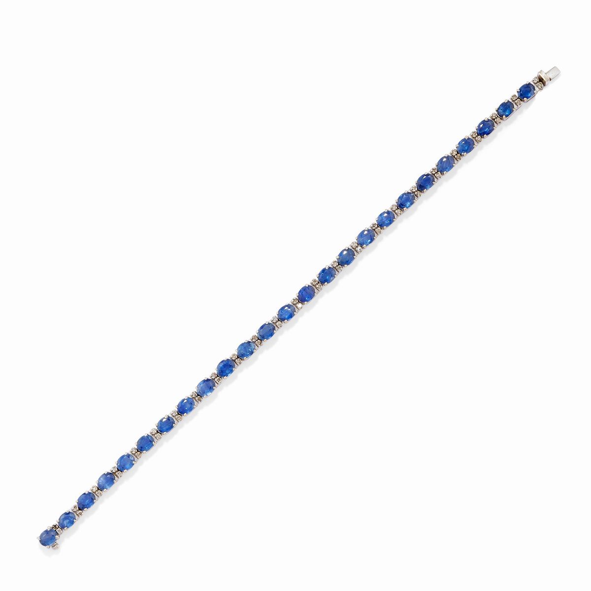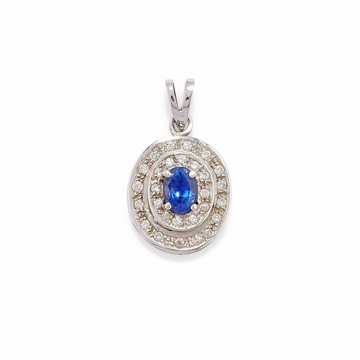 in oro bianco 18kpendente con zaffiro taglio ovale entro doppio giro di diamanti taglio brillante, bracciale tennis con zaffiri taglio ovale e diamanti taglio brillante