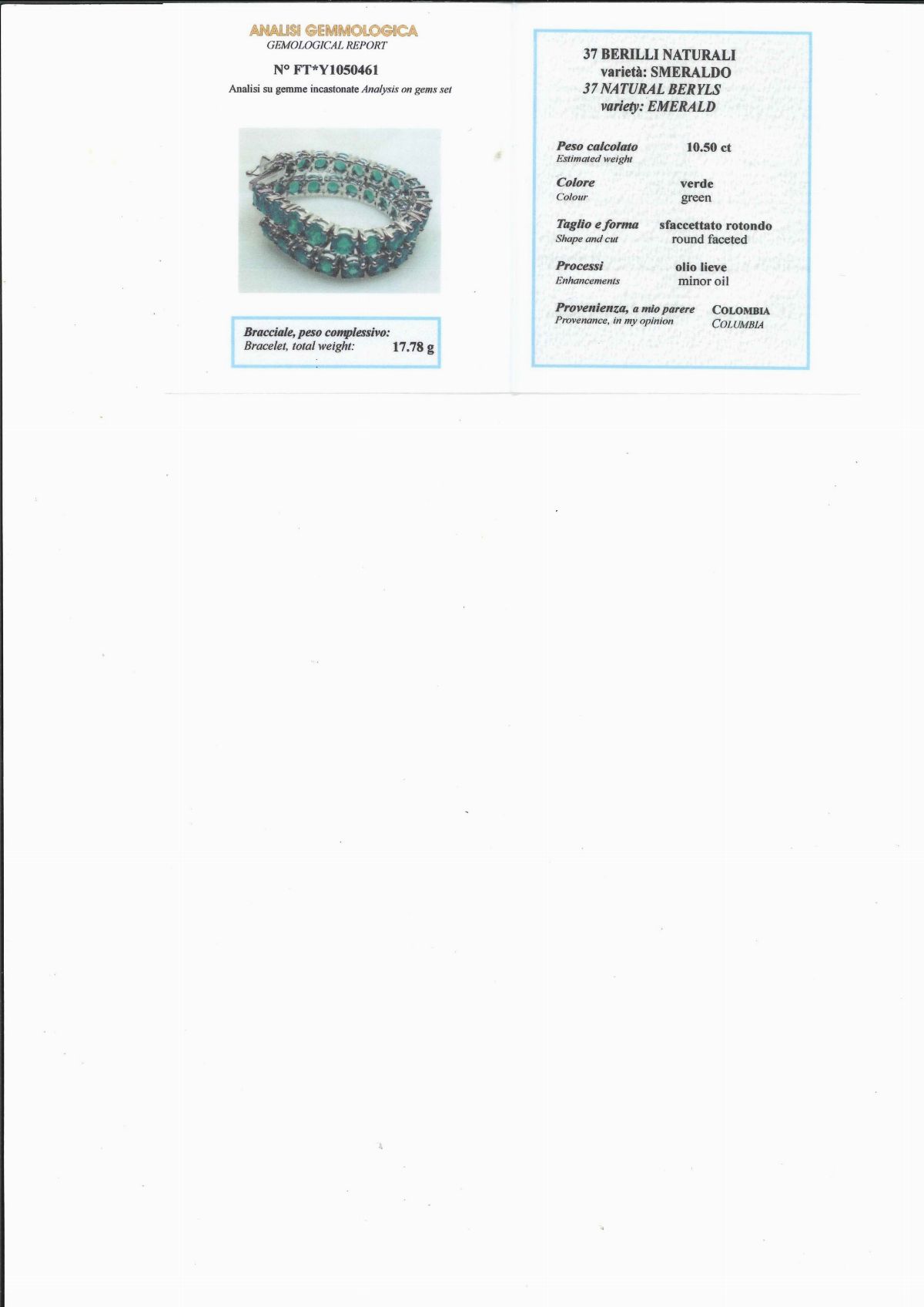Gli smeraldi che presentano "minor oil" sono accompagnati da analisi gemmologica n. FT*Y1050461 del Dott. Giulio Provera, Valenza