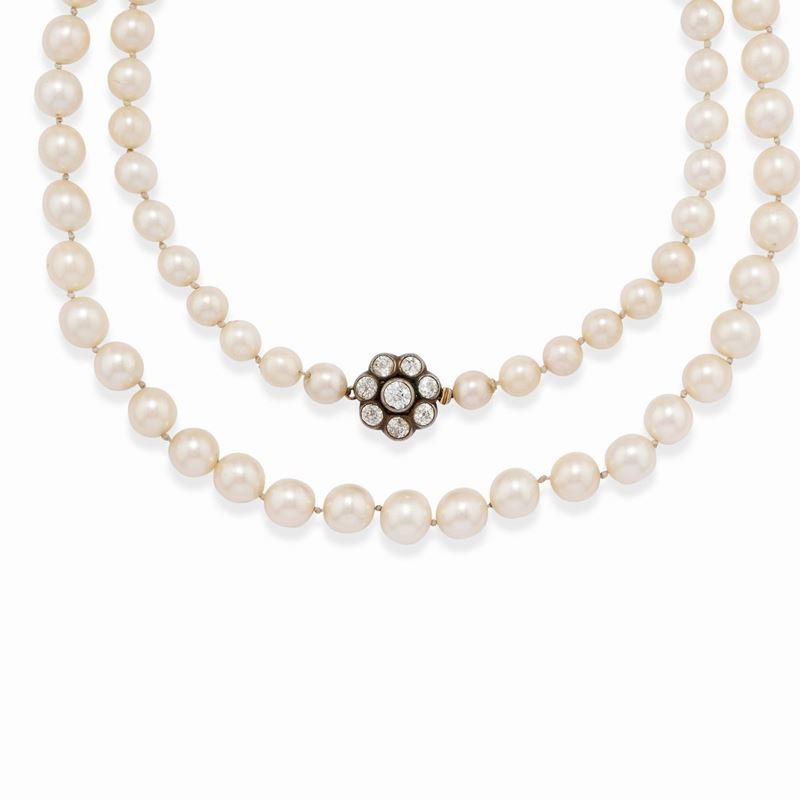 in argento e oro giallo 18kad un filo di perle coltivate di mm 8,50/9,00 circa, chiusura a fiore con diamanti taglio vecchio per totale ct 2,50 circa.