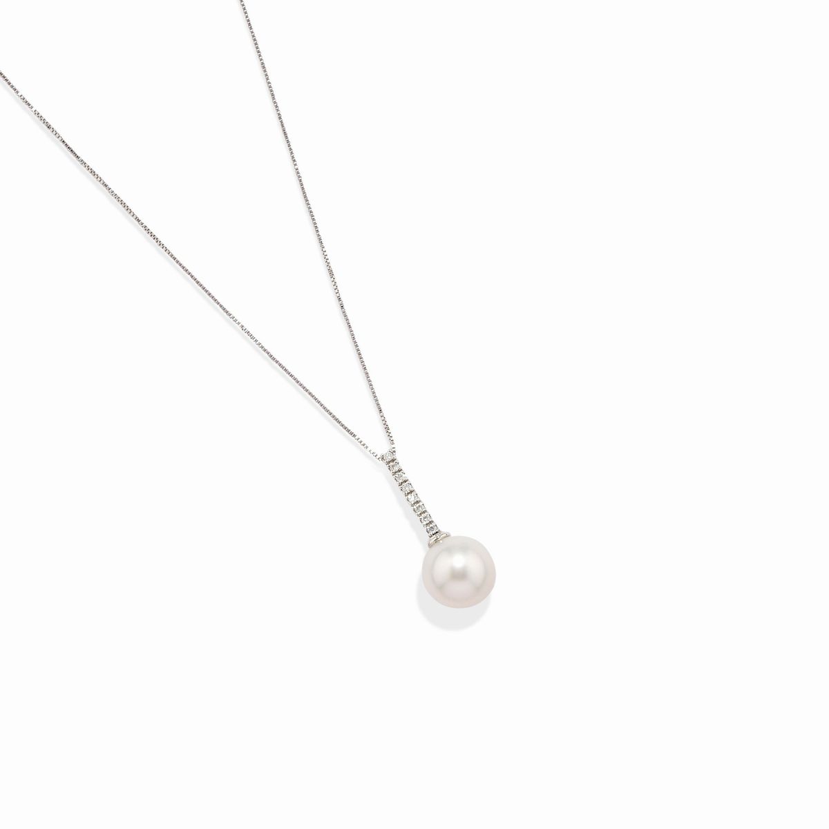 in oro bianco 18kpendente con perla coltivata di mm 11,00 circa e diamanti taglio brillante disposti in linea, coppia di orecchini con perle coltivate di mm 8,00 circa e piccoli diamanti taglio brillante, chiusura perno e farfalla, difetti (una farfalla mancante).