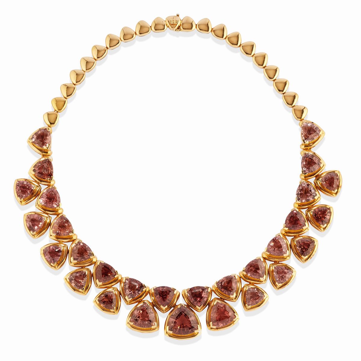in oro giallo 18kcomposta da collana e coppia di orecchini con chiusura a clip impreziosita da tormaline rosa taglio scudo.