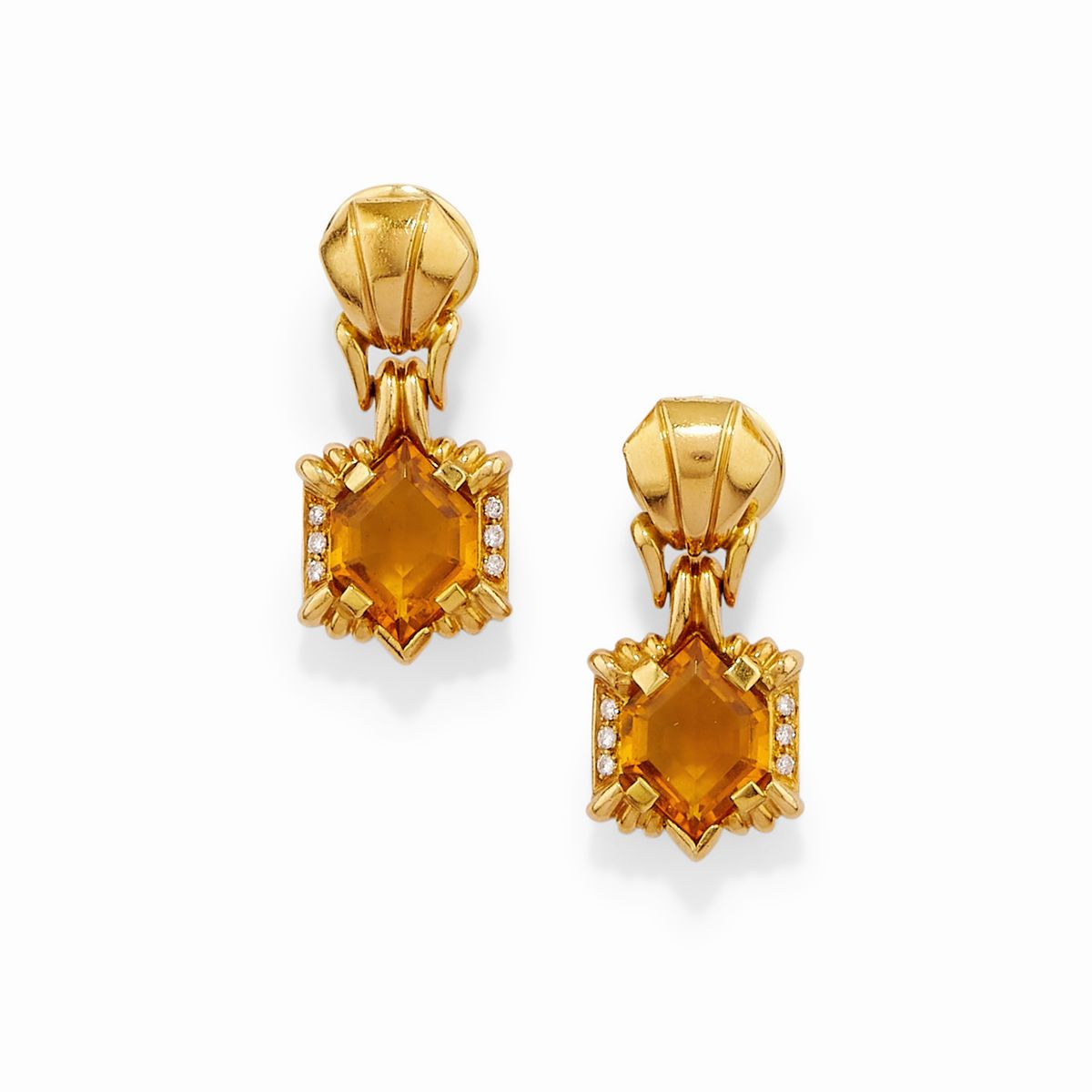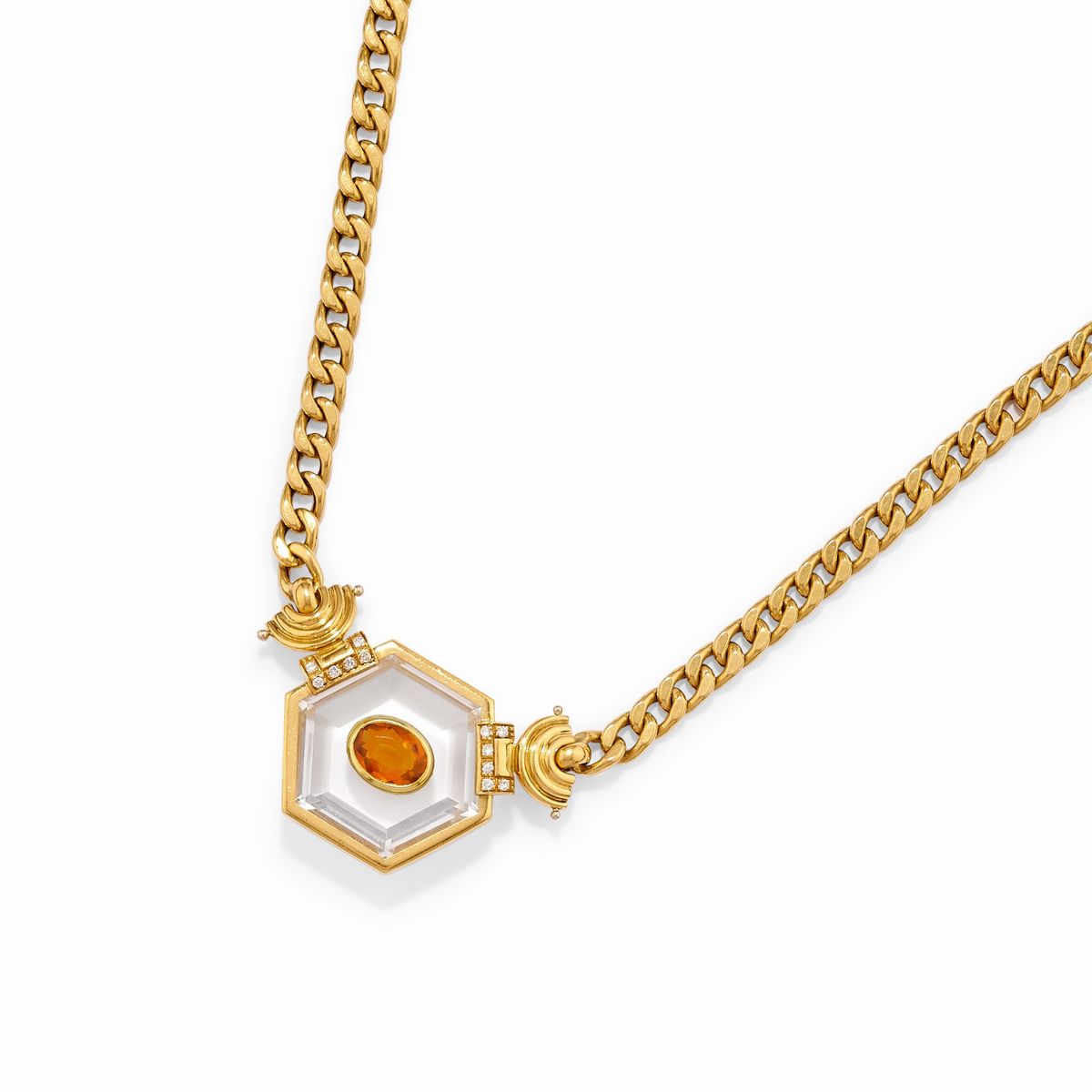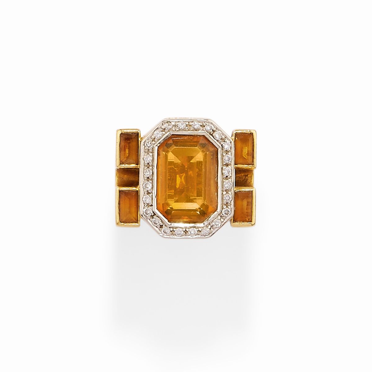 in oro bicolore 18kun anello con quarzo rettangolare a contorno ottagonale e cornice in diamanti taglio brillante, un anello con quarzi taglio ovale e decoro in piccoli diamanti taglio brillante, collana con al centro quarzo taglio ovale e piccoli diamanti a decoro, orecchini con quarzi taglio romboidale e piccoli diamanti taglio brillante, chiusura perno e farfalla.