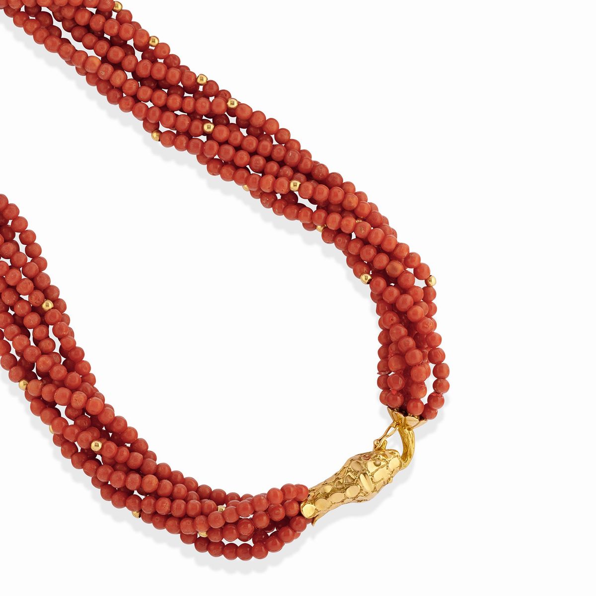 in oro giallo 18kuna a cinque fili di boules di corallo di mm 4,00 circa e chiusura impreziosita da corallo taglio marquise, una a sette fili di boules di corallo di mm 4,50 circa alternate a sfere in oro, chiusura a testa di serpente.