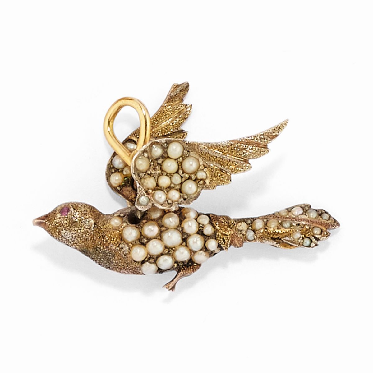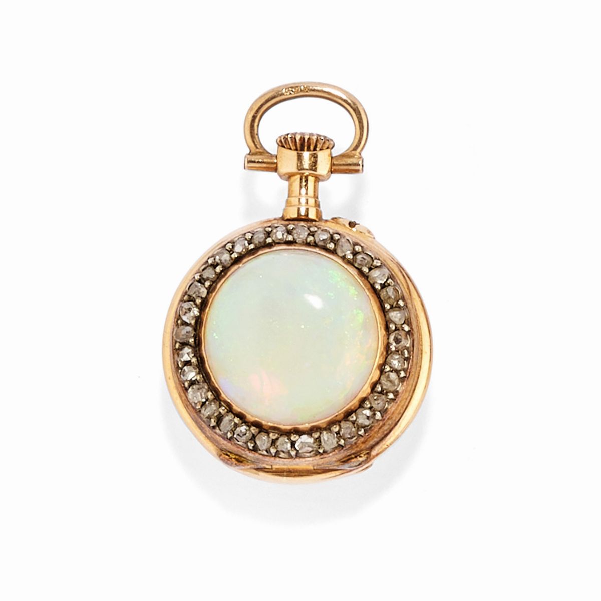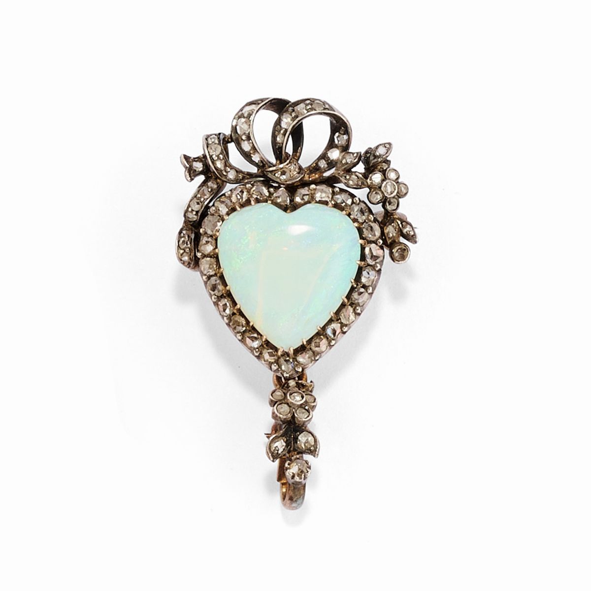 in oro giallo 18k, bassa caratura, metallo e argentocomposto da una monachina con opale taglio rotondo cabochon e diamanti taglio rosa, una spilla con opale e diamanti taglio rosa e da un pendente uccellino con microperle, difetti (segni di filatura sull'opale taglio cuore).
