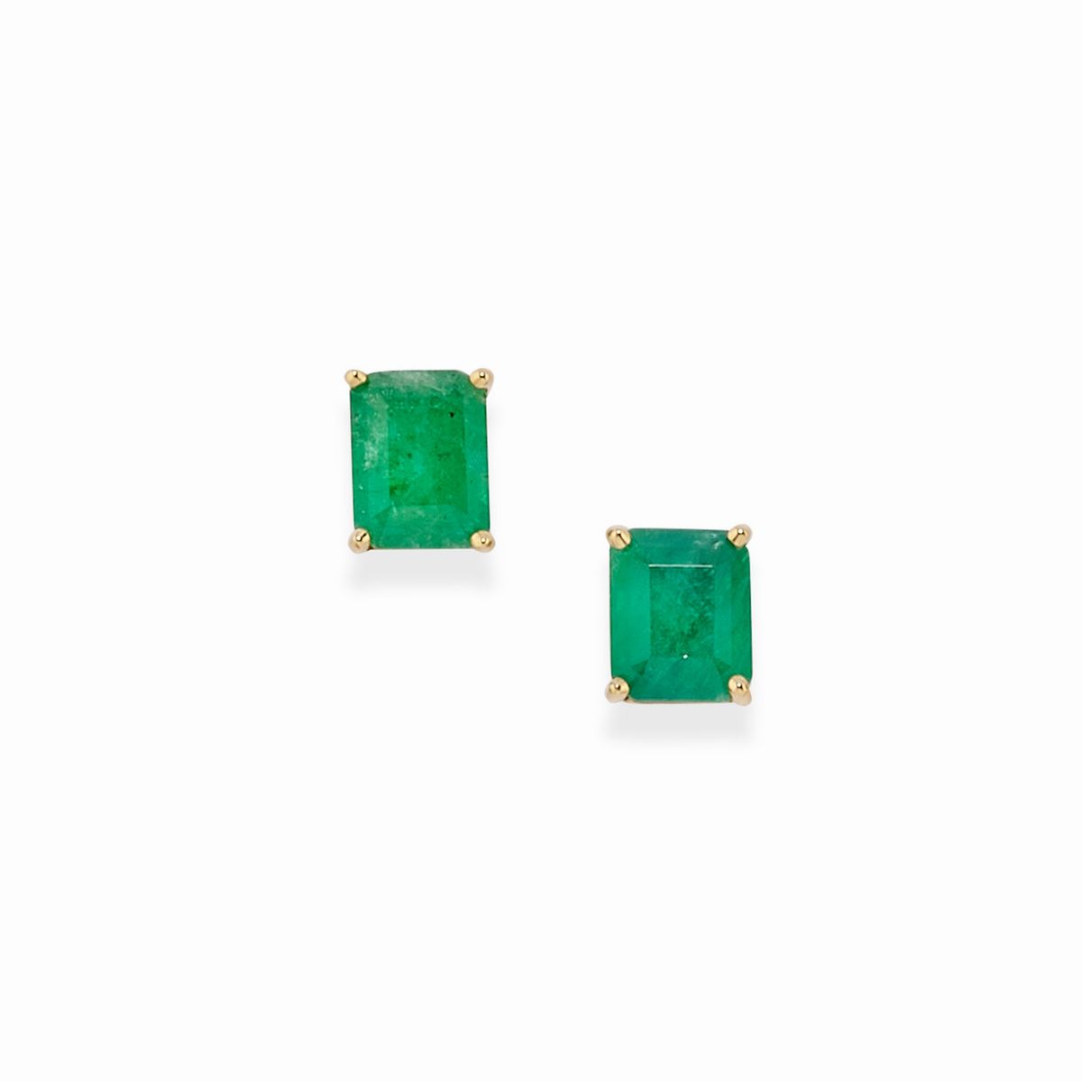 in oro giallo 18kcon al centro smeraldi taglio rettangolare a contorno ottagonale per totale ct 3,00 circa, chiusura perno e farfalla.