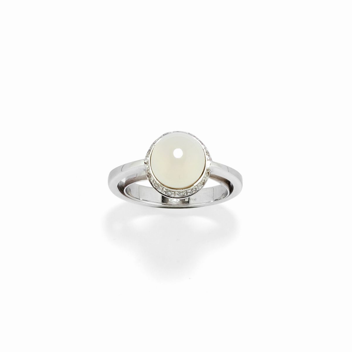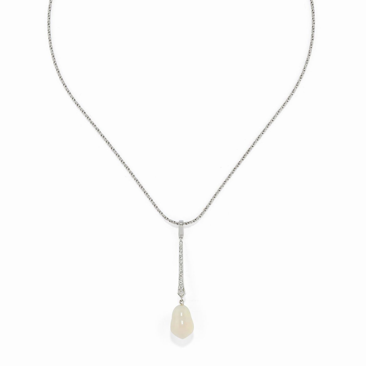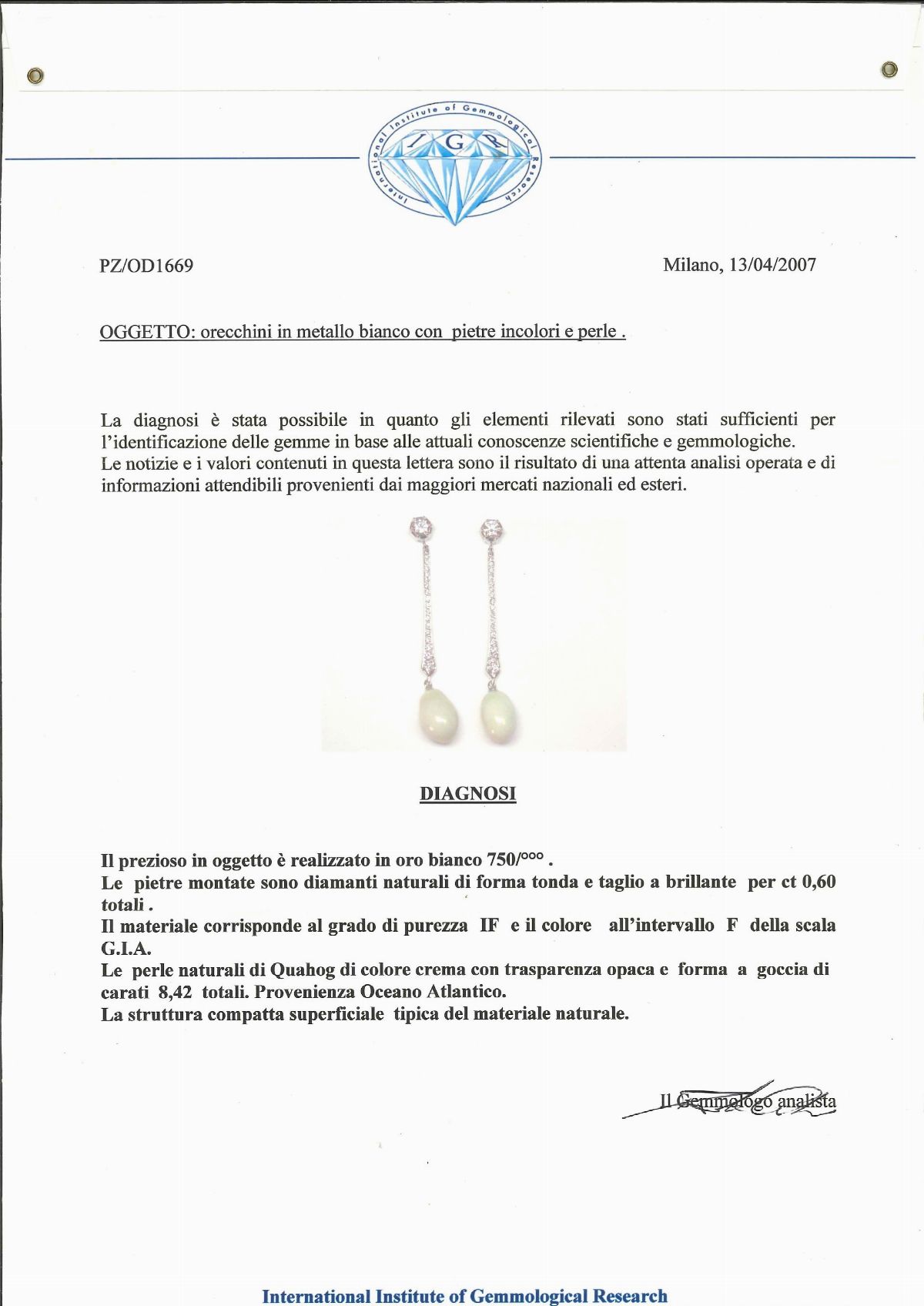 in oro bianco 18kcomposta da anello, coppia di orecchini pendenti con chiusura a perno e farfalla e pendente trattenuto da collana, con perle naturali Quahog di colore bianco, forma a goccia e bottone per totale ct 21,63, diamanti taglio brillante colore F, purezza IF per totale ct 0,99.