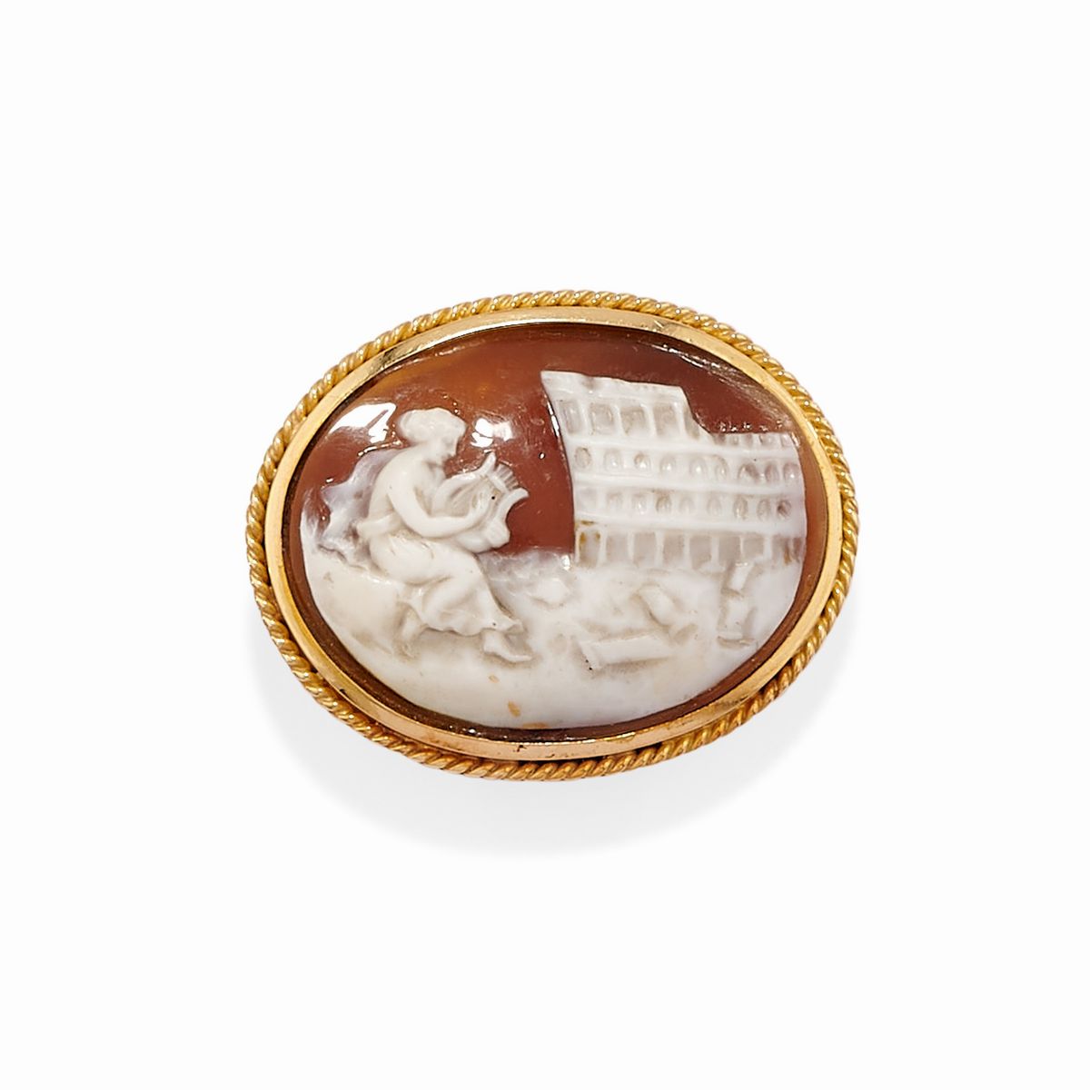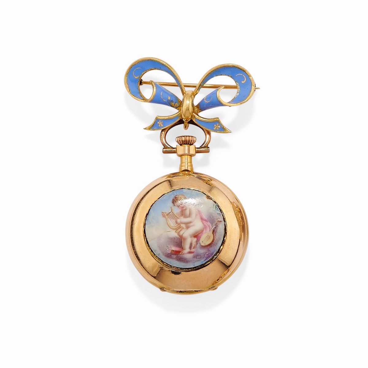 in oro giallo 18kspilla con cammeo lavorato ad alto rilievo e spilla orologio decorata in smalto, difetti (visibili mancanze di smalto e lievi ammaccature sull'orologio).