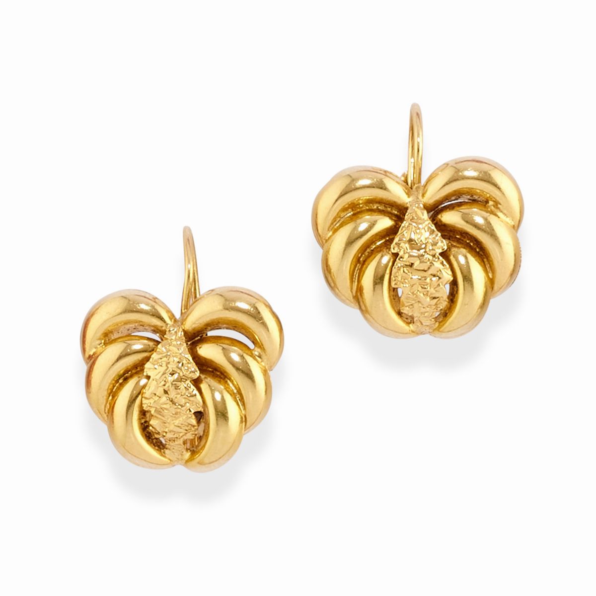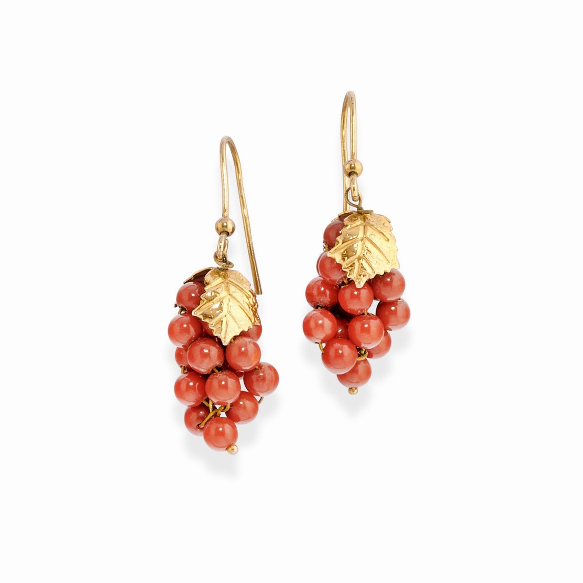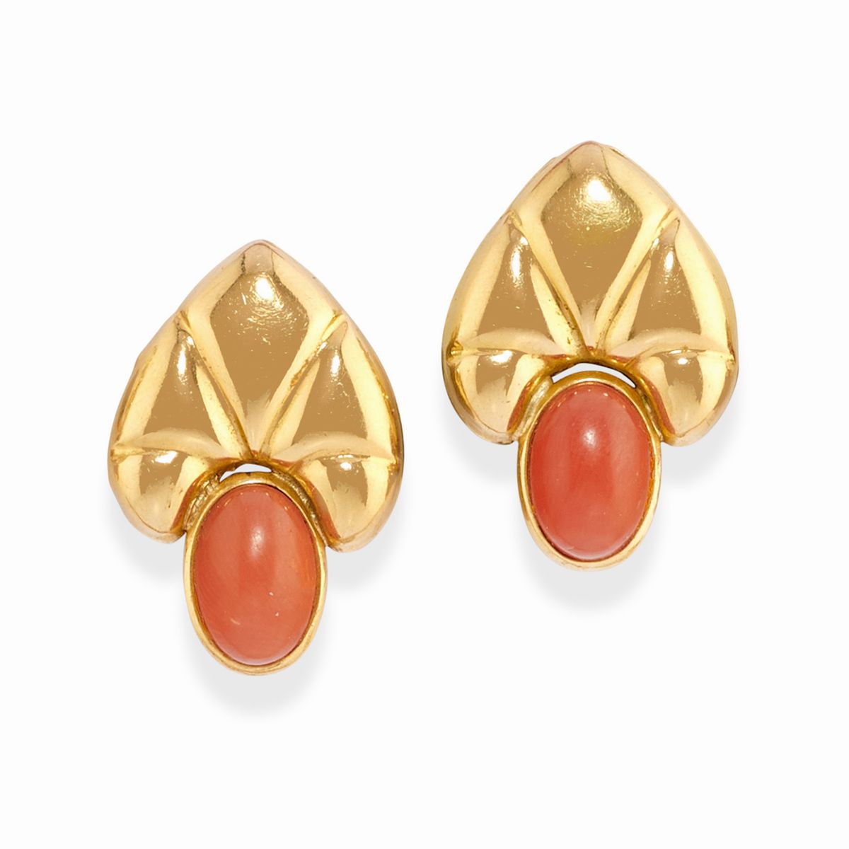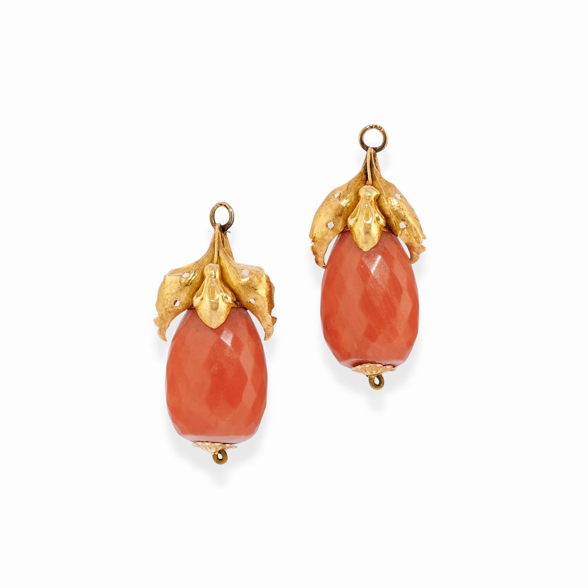 in oro giallo 18kdue coppie di orecchini con inserti in corallo, chiusura perno e farfalla e monachella aperta, una coppia di orecchini con motivo a foglie con chiusura a monachella, due pendenti con gocce in corallo sfaccettato.