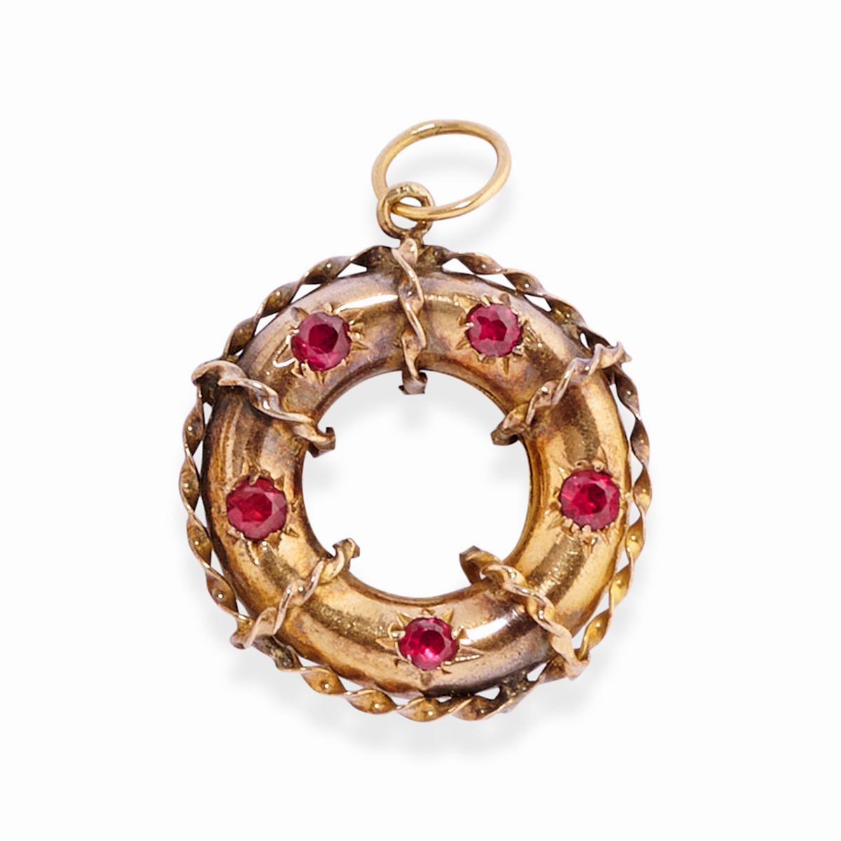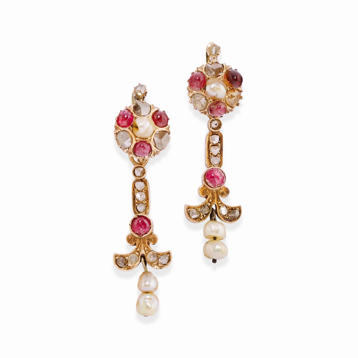in oro bassa caratura e argentodi varie forme e raffigurazioni, differenti decori, pietre rosse, rubini, diamanti taglio rosa e piccole perle, con chiusura a monachella, perno e vite e perno e clip.