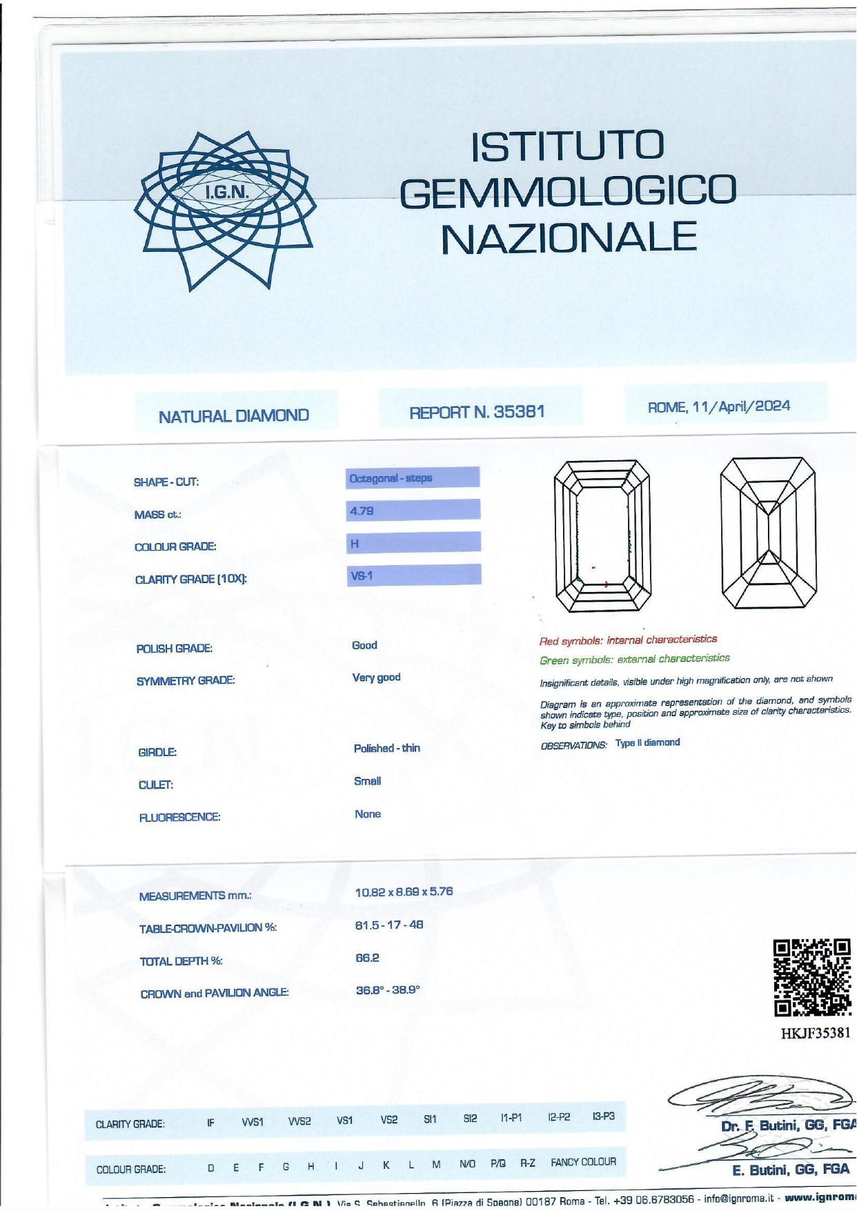 in oro bianco 18kal centro diamante taglio ottagonale a gradini di ct 4,79, colore H, purezza VS1, ai lati quattro diamanti taglio ottagonale a gradini per totale ct 0,60 circa, prob. colore H/I, purezza VVS/VS.