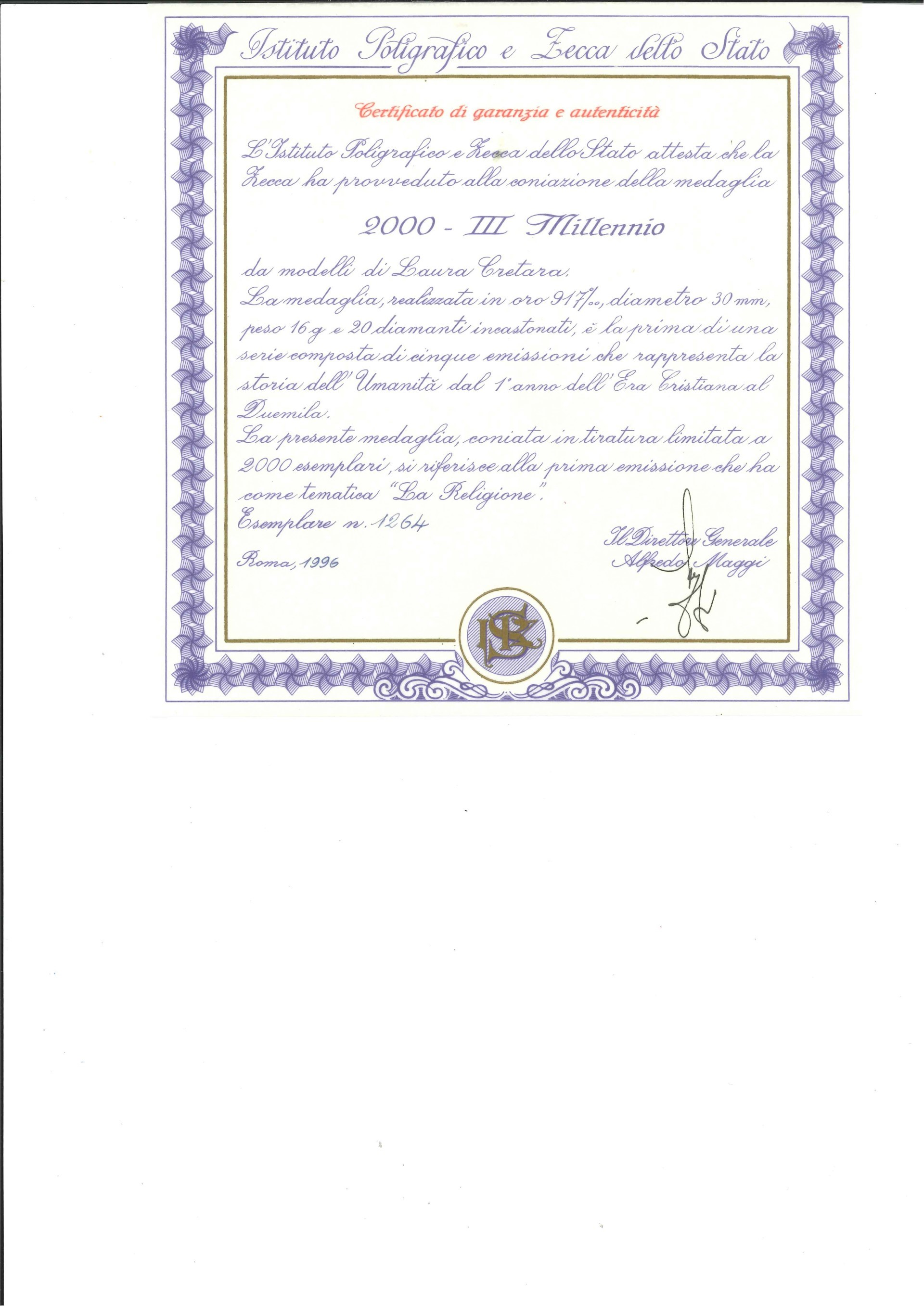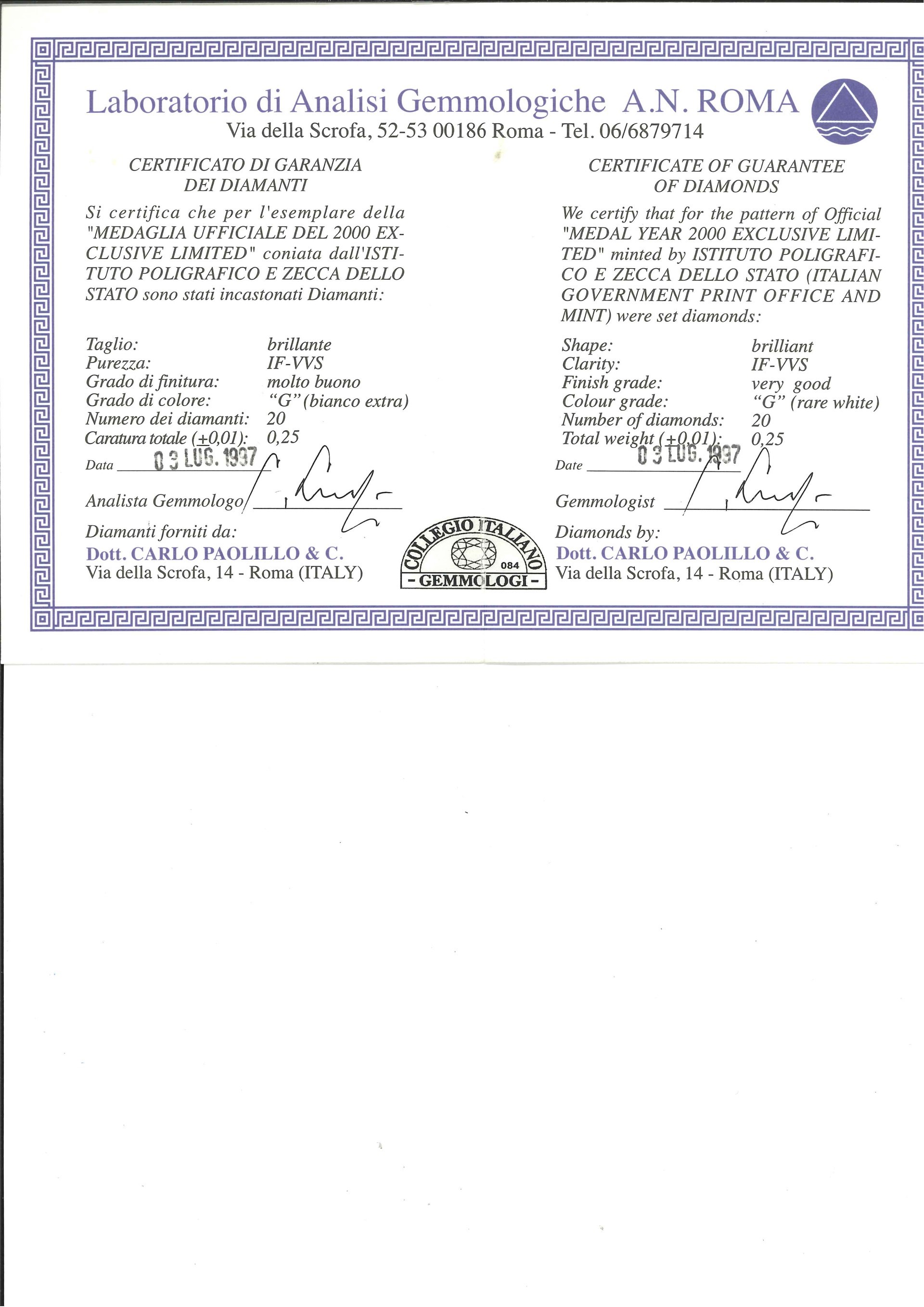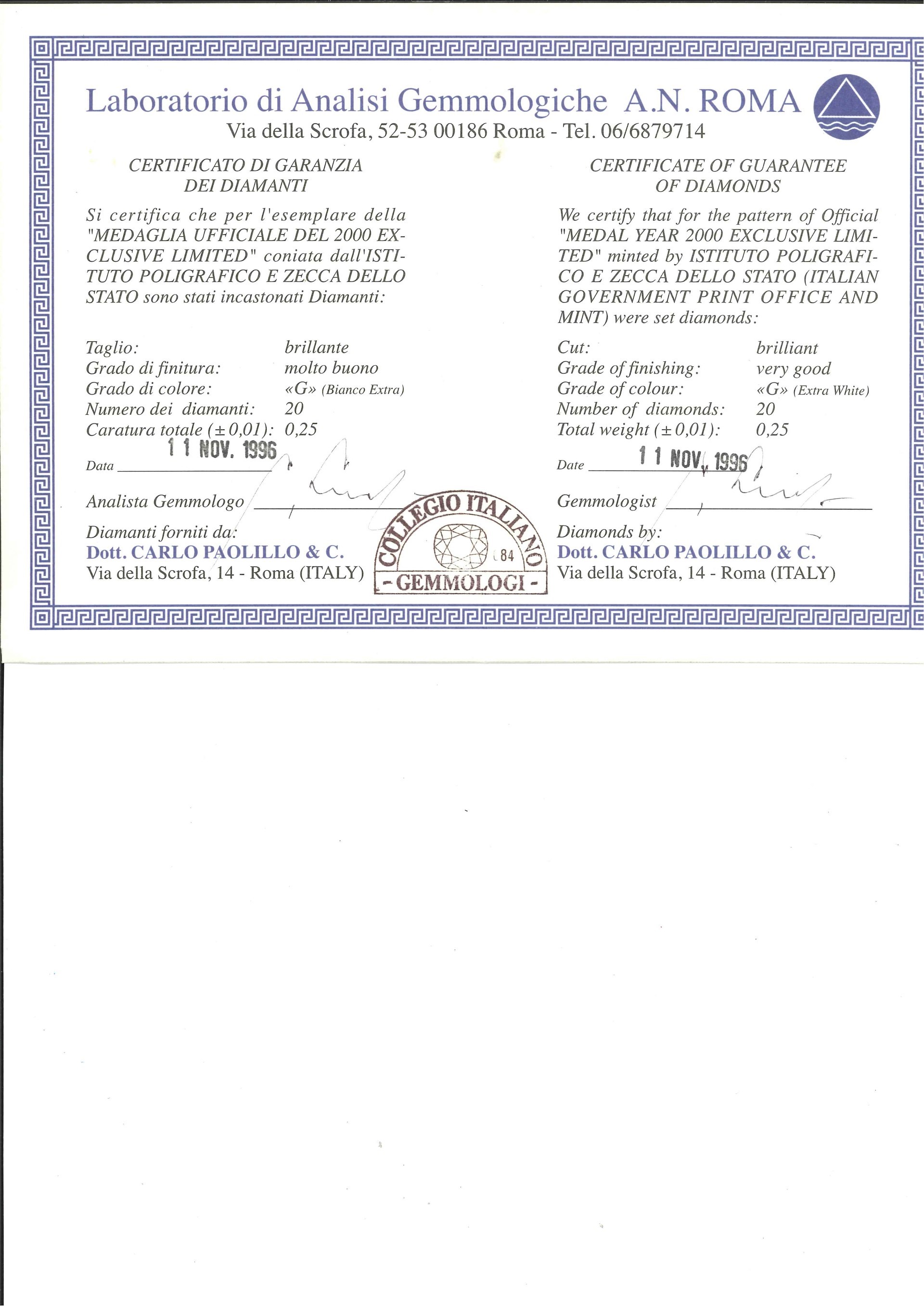in oro giallo 917"Emissione ufficiale del 2000" realizzate dall'Istituto poligrafico e Zecca dello Stato, con diamanti taglio brillante per totale ct 1,25, con scatole.