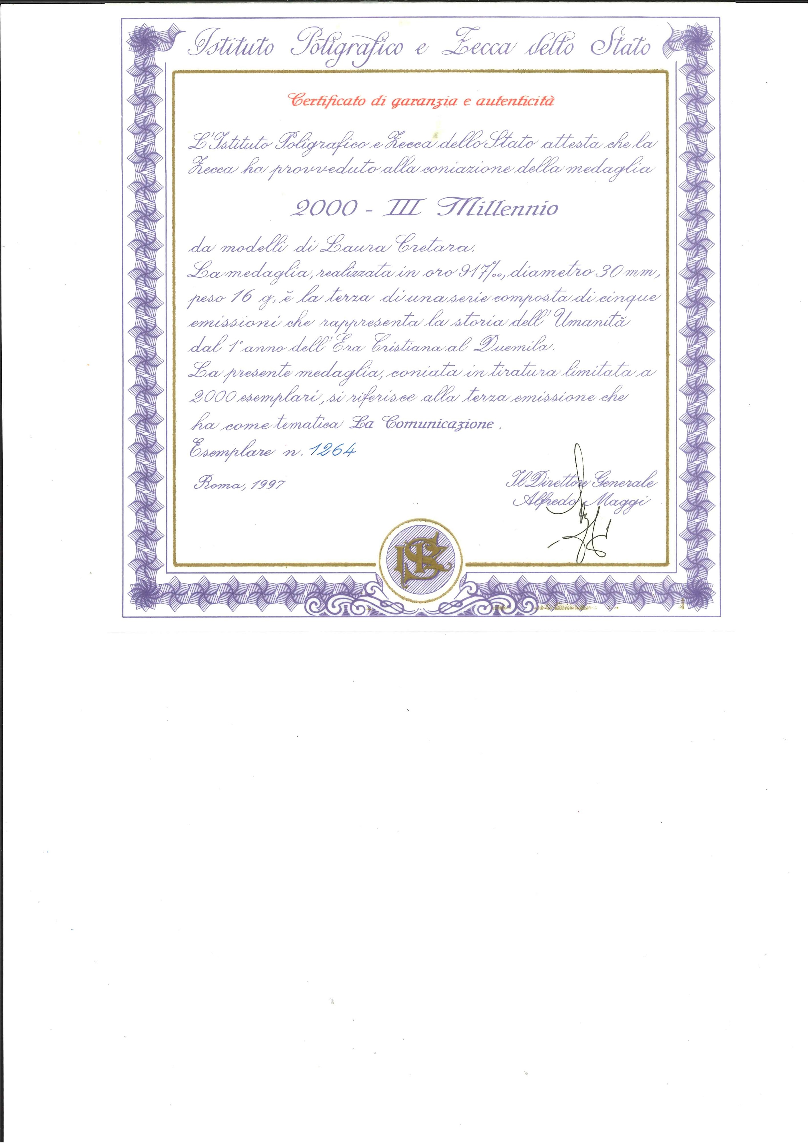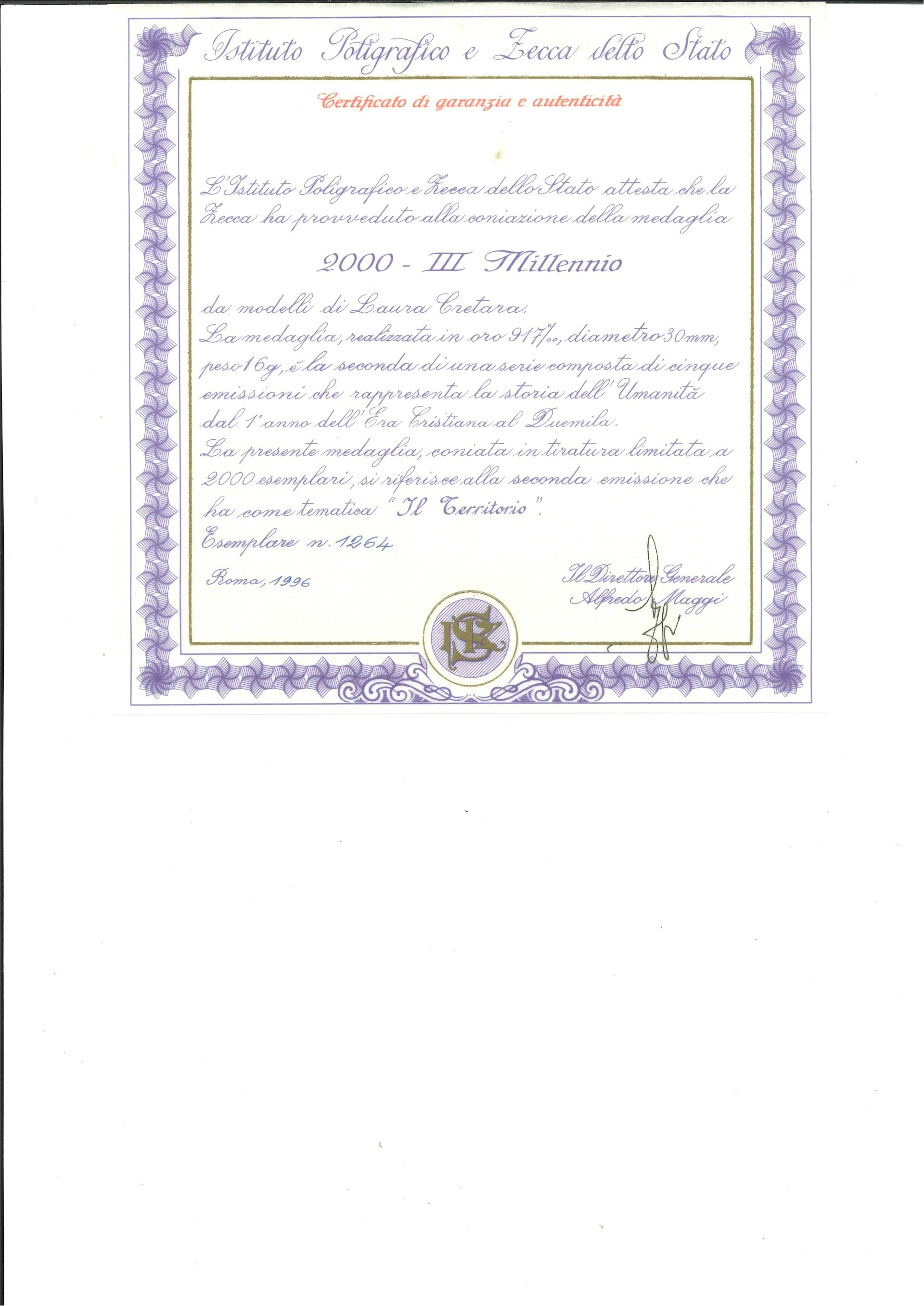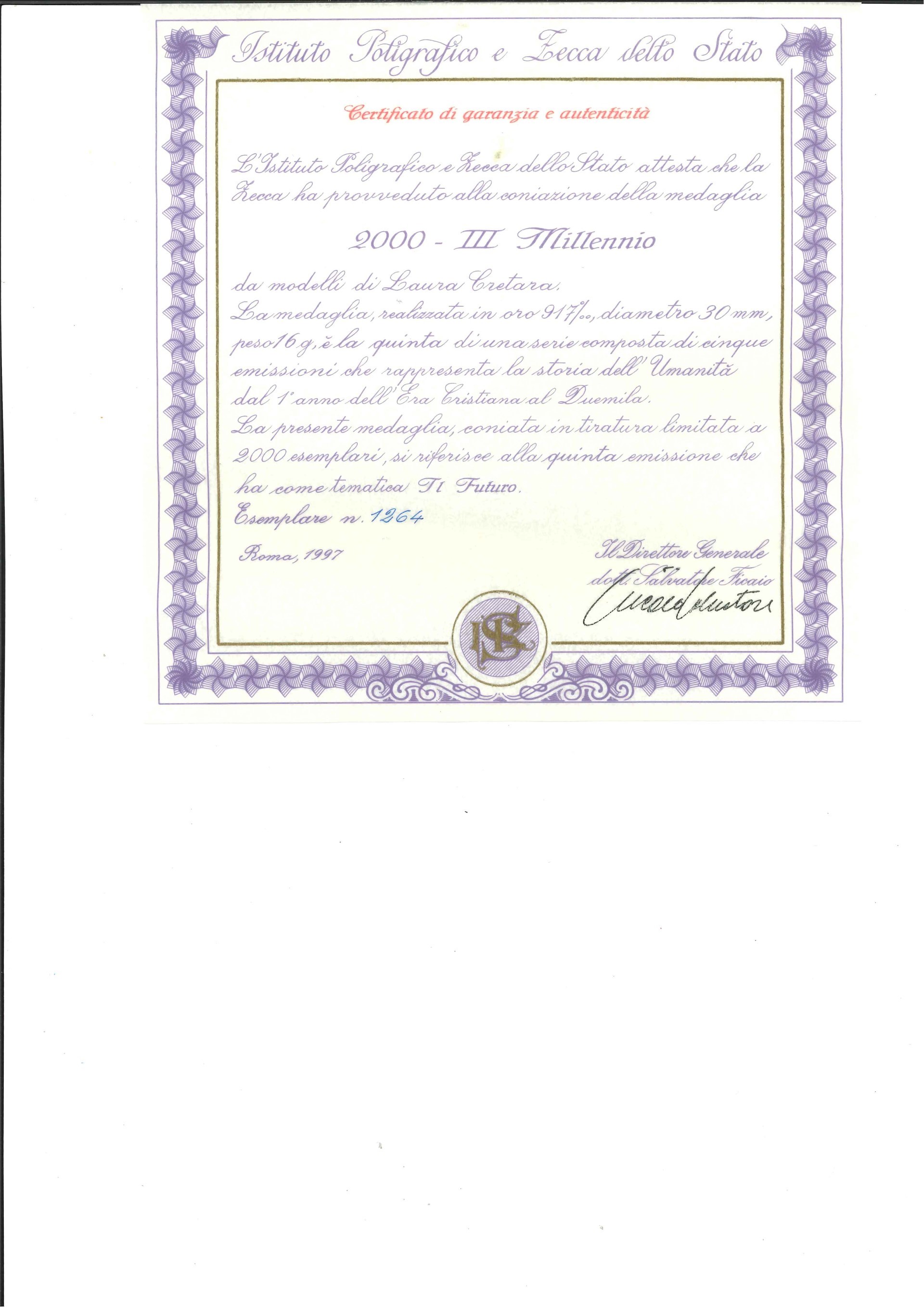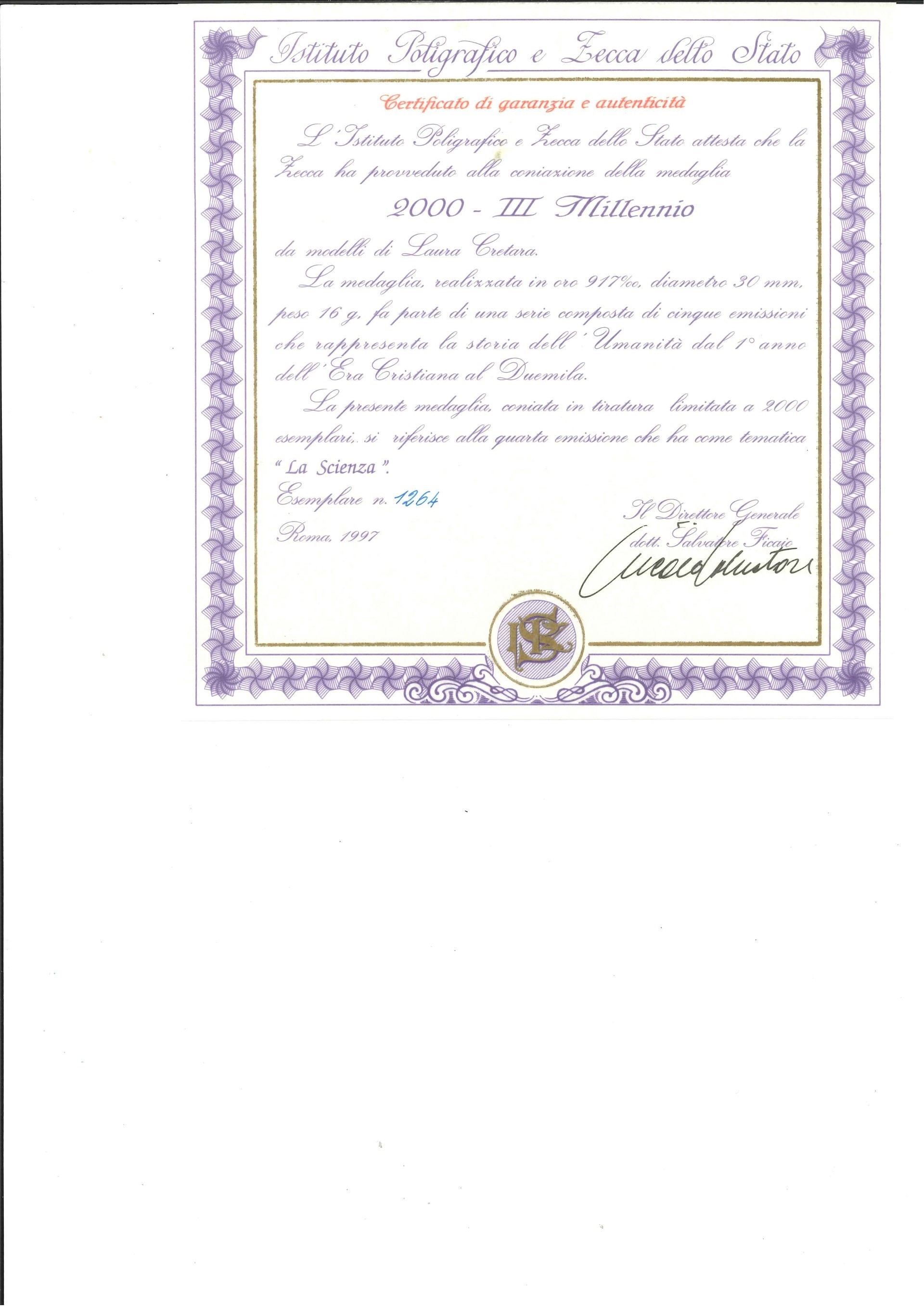 in oro giallo 917"Emissione ufficiale del 2000" realizzate dall'Istituto poligrafico e Zecca dello Stato, con diamanti taglio brillante per totale ct 1,25, con scatole.