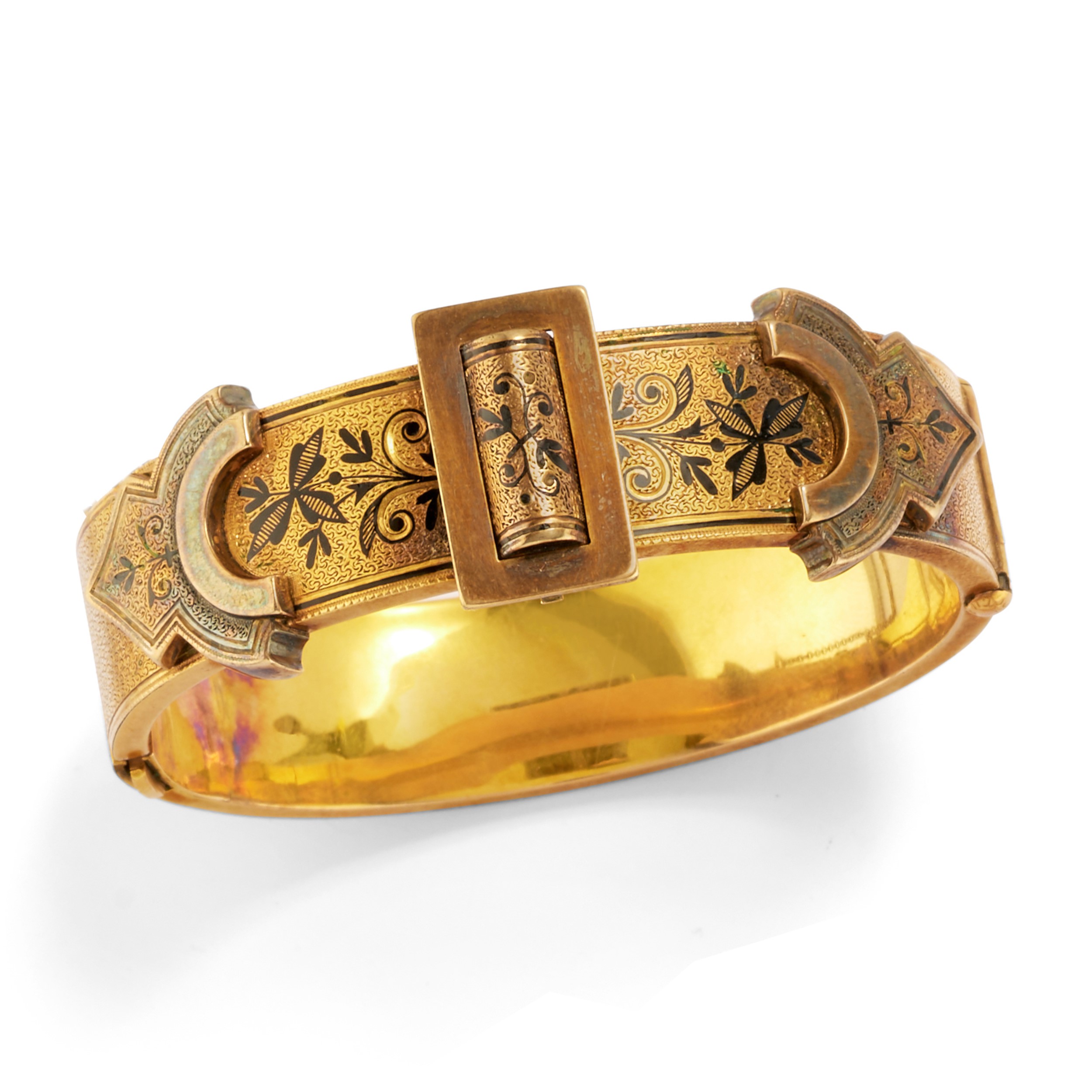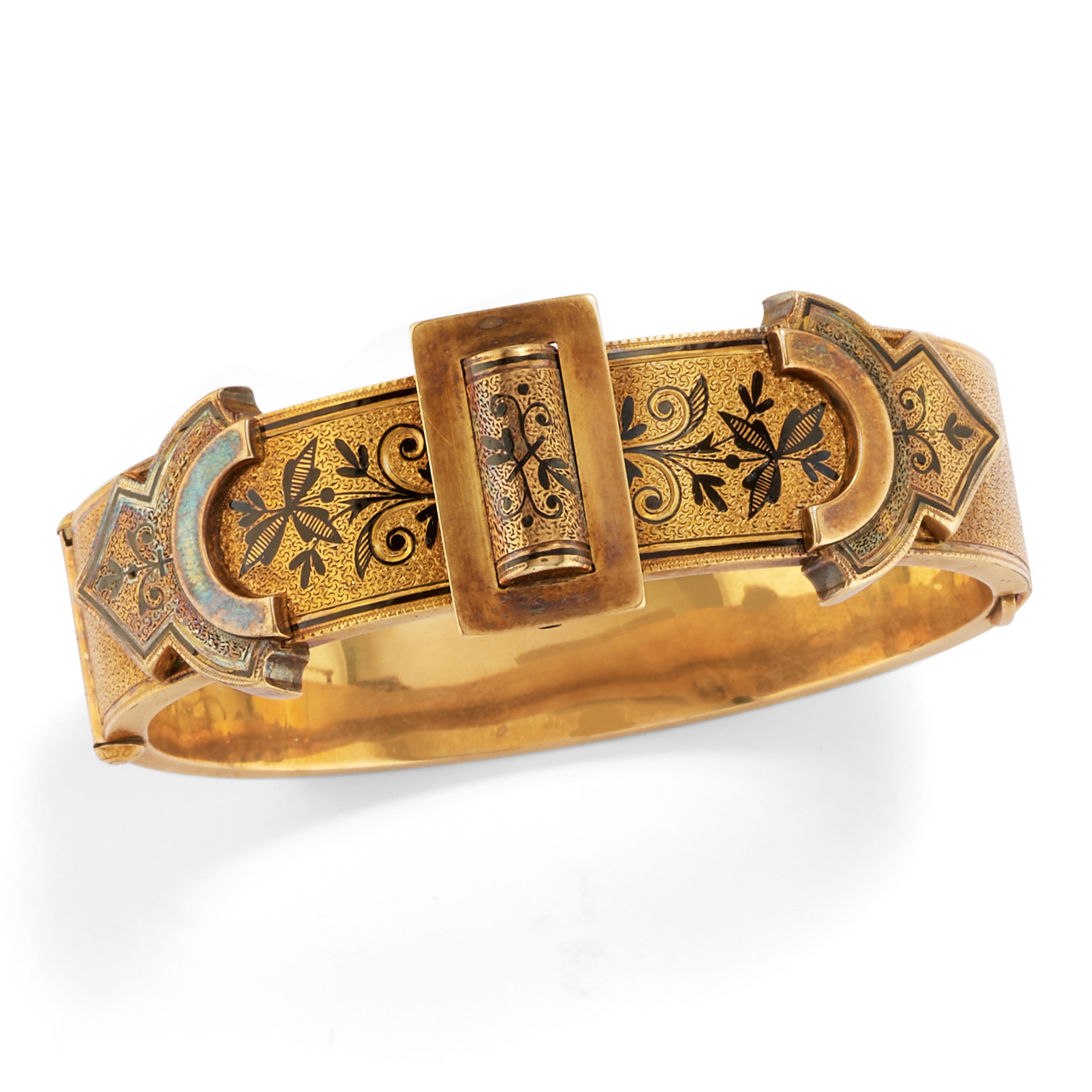 in oro giallo 14krigidi, in oro scatolato a sezione rettangolare, al centro motivo a fibbia con decoro in smalto nero, con astuccio.