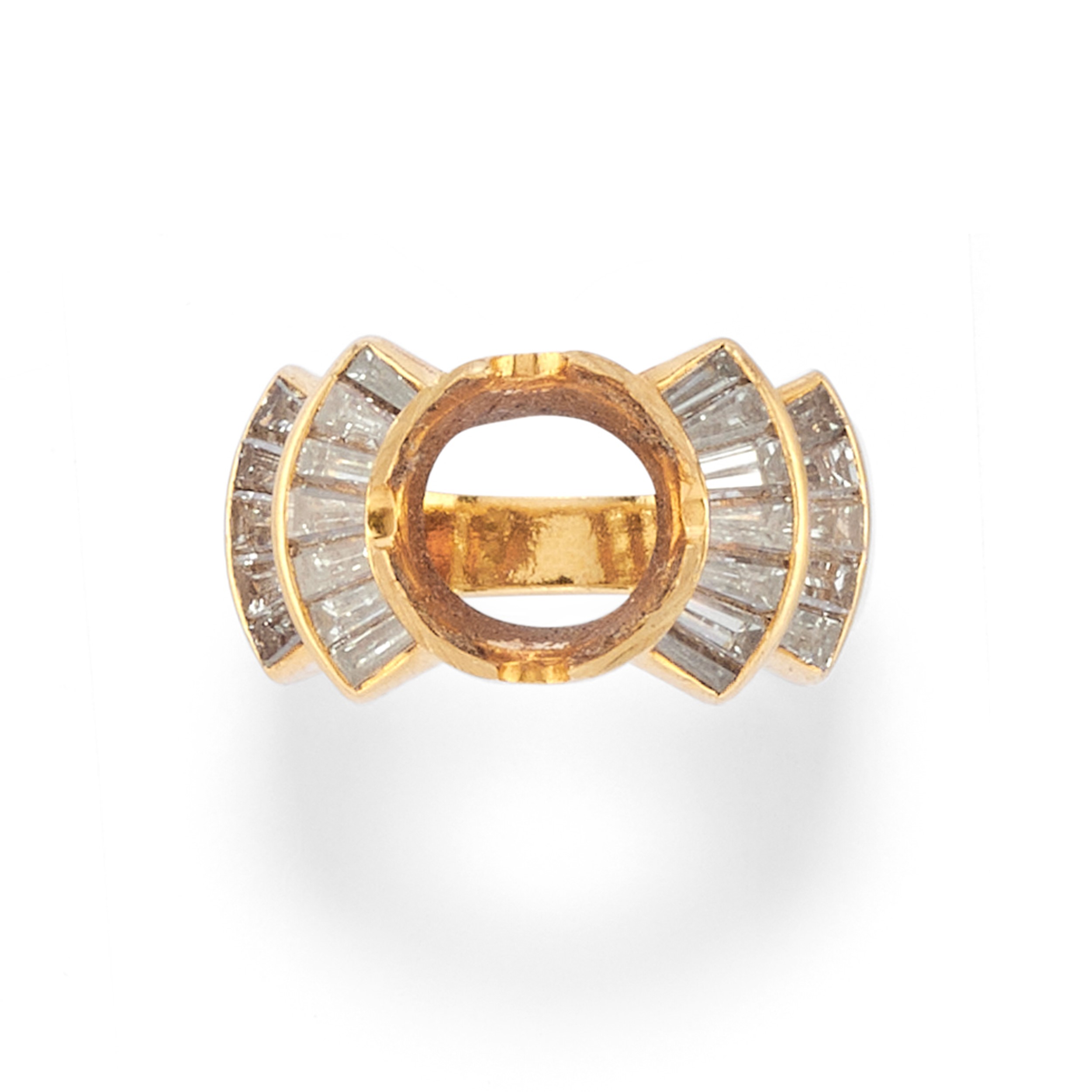 in oro giallo 18kdiamante taglio brillante di ct 4,05, colore N, purezza VS1, montatura con spallette gradinate impreziosite da diamanti taglio tapered baguette per totale ct 1,00 circa.
