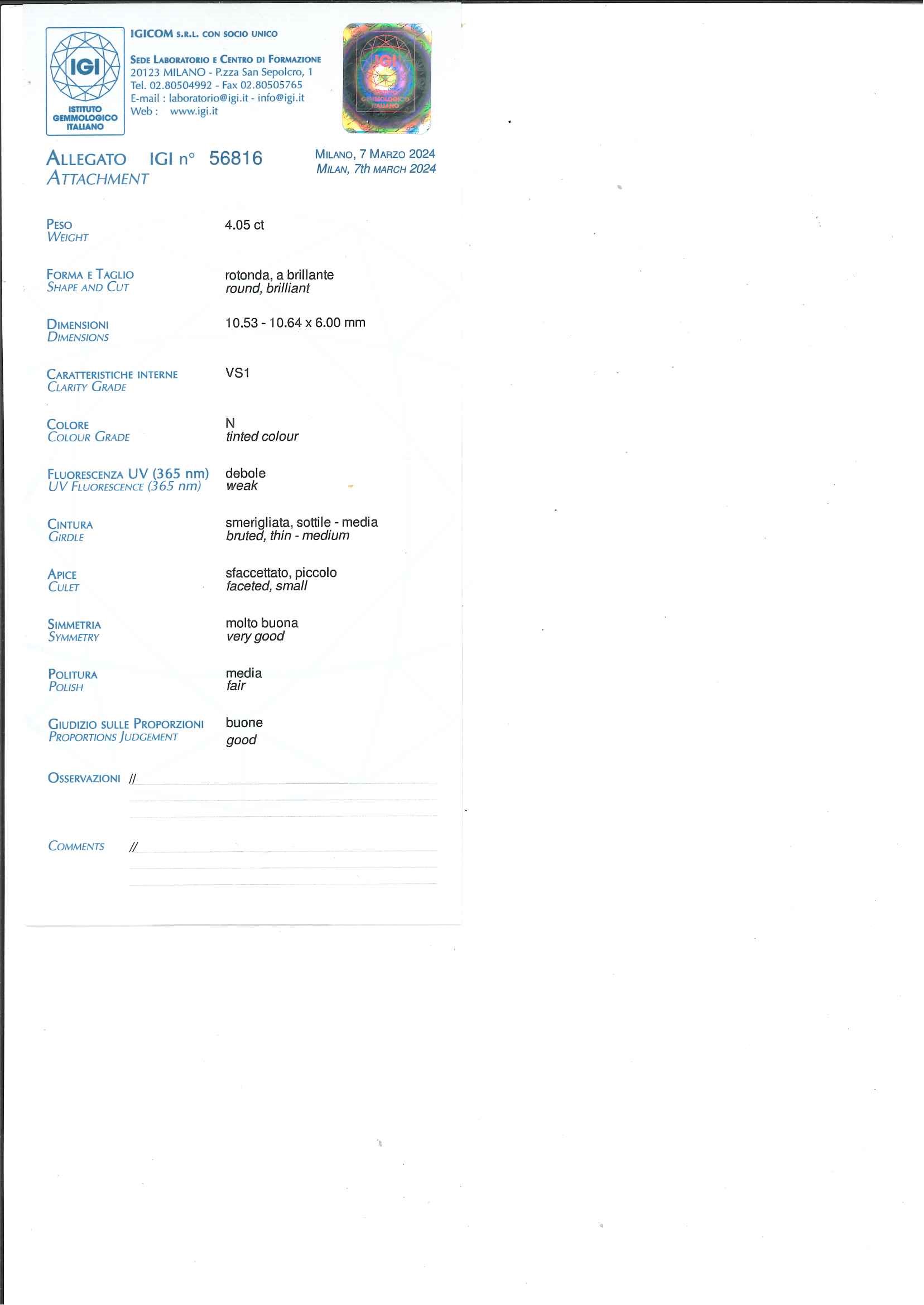 Il diamante, sigillato in blister, è accompagnato da certificato gemmologico n. 56816 del 07/03/2024 IGI, Milano.