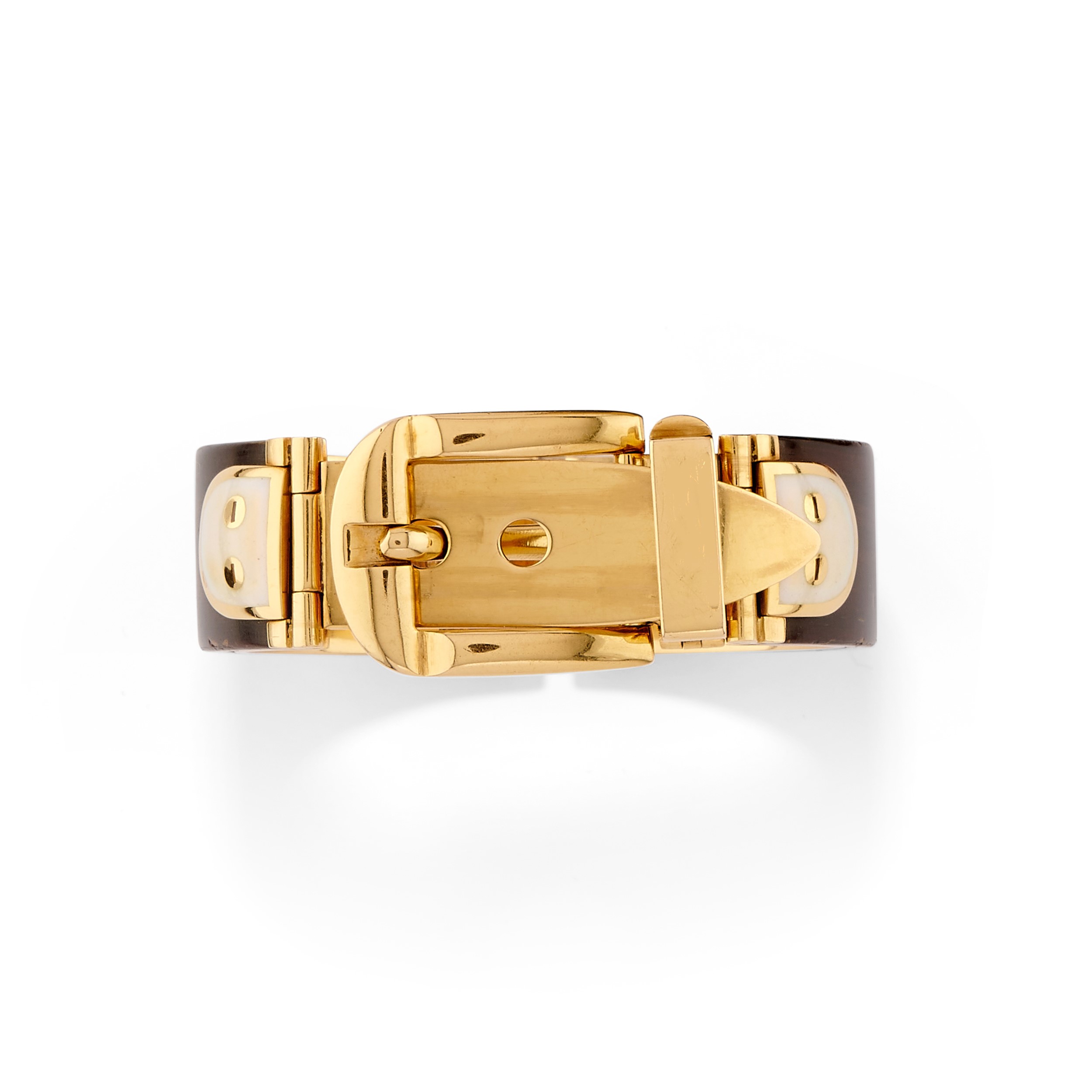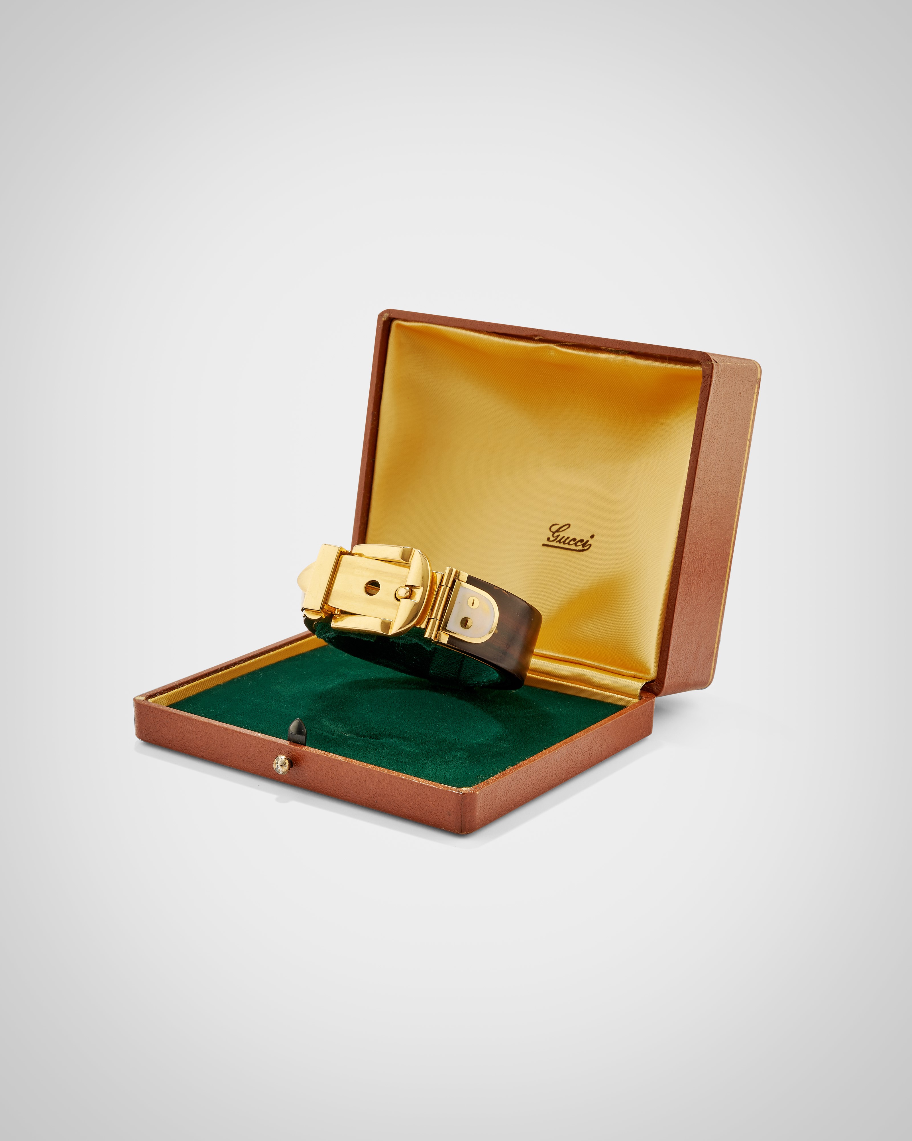 in oro giallo 18krigido, con inserti in legno e smalto, chiusura a fibbia, con astuccio, difetti (piccoli segni di usura sul legno).