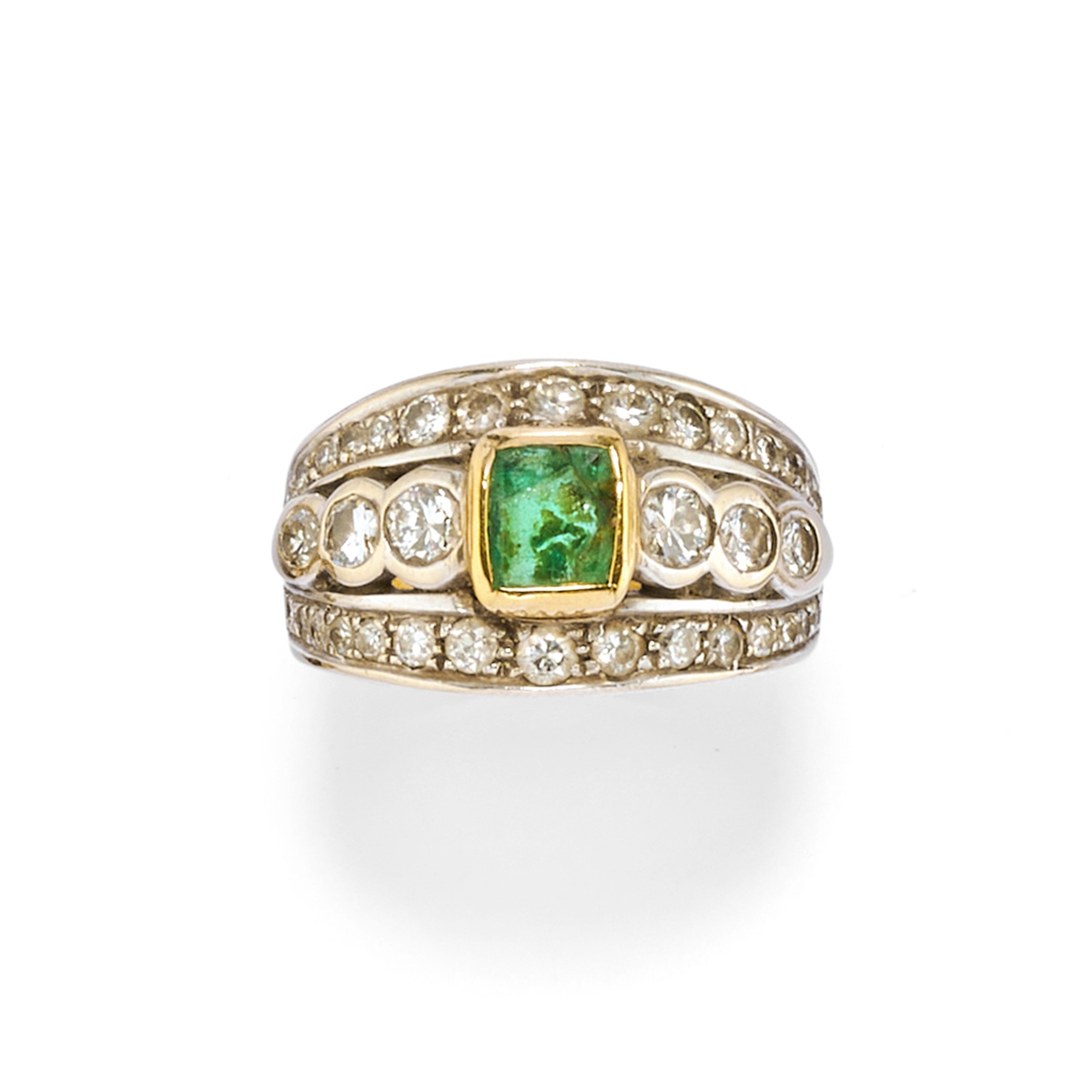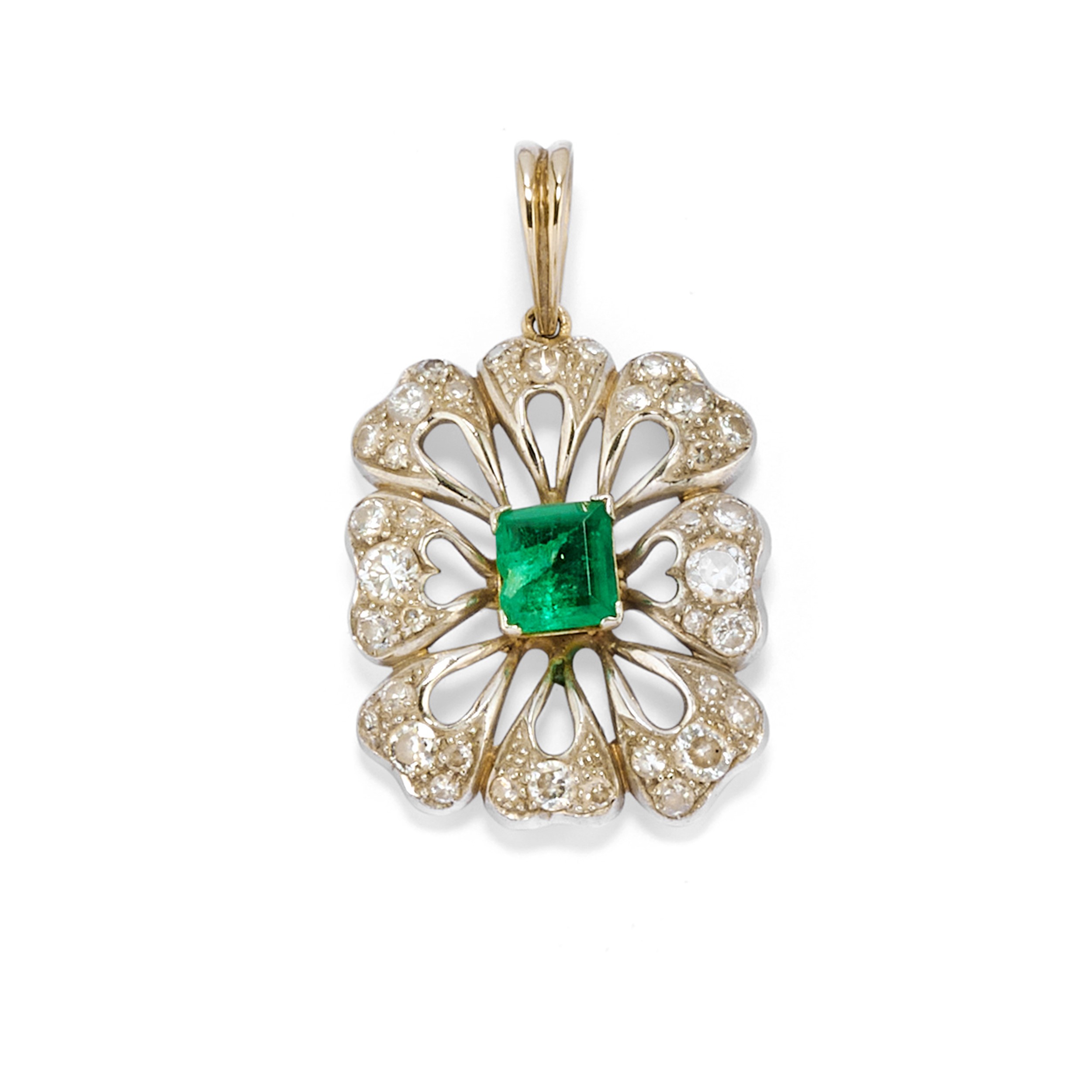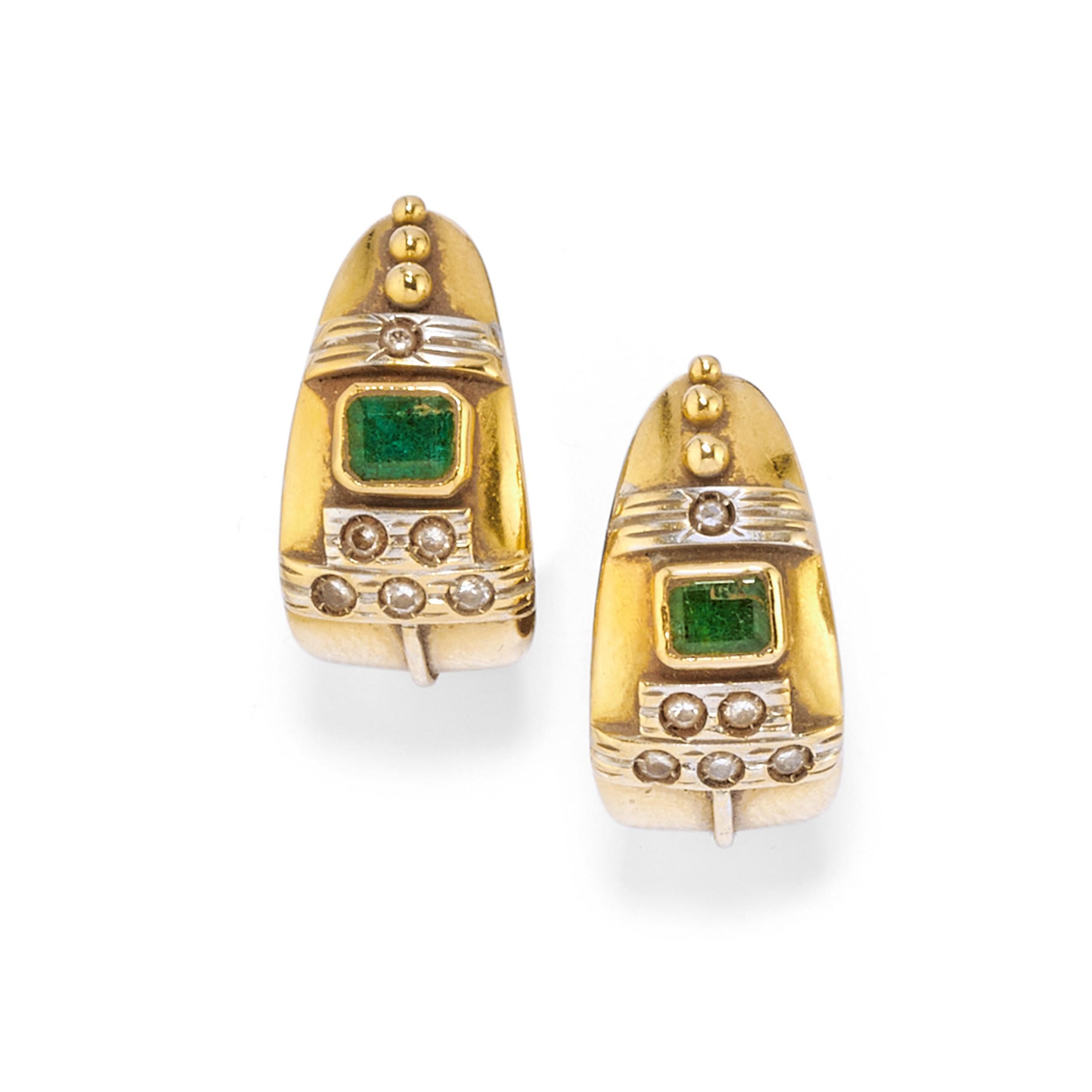smeraldi taglio rettangolare a contorno ottagonale, diamanti taglio brillante, vecchio e huit-huit, pietre incolore sintetiche e orecchini con chiusura a clip, difetti (smeraldi con mancanza di materiale).