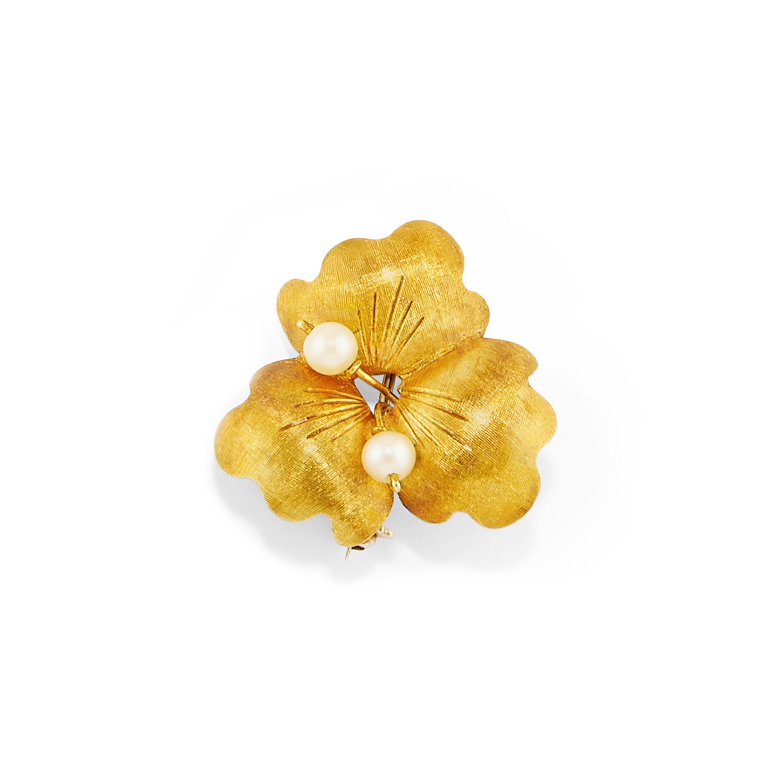 bracciale con maglia a tessuto e zaffiri taglio rotondo, spilla-pendente a forma di fiore con due perle coltivate, difetti (lieve ammaccatura al bracciale).