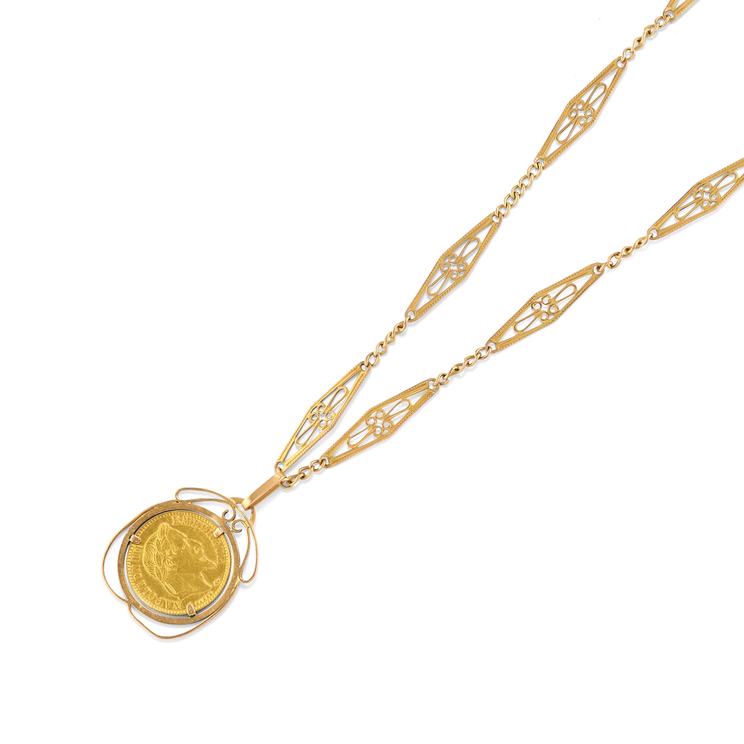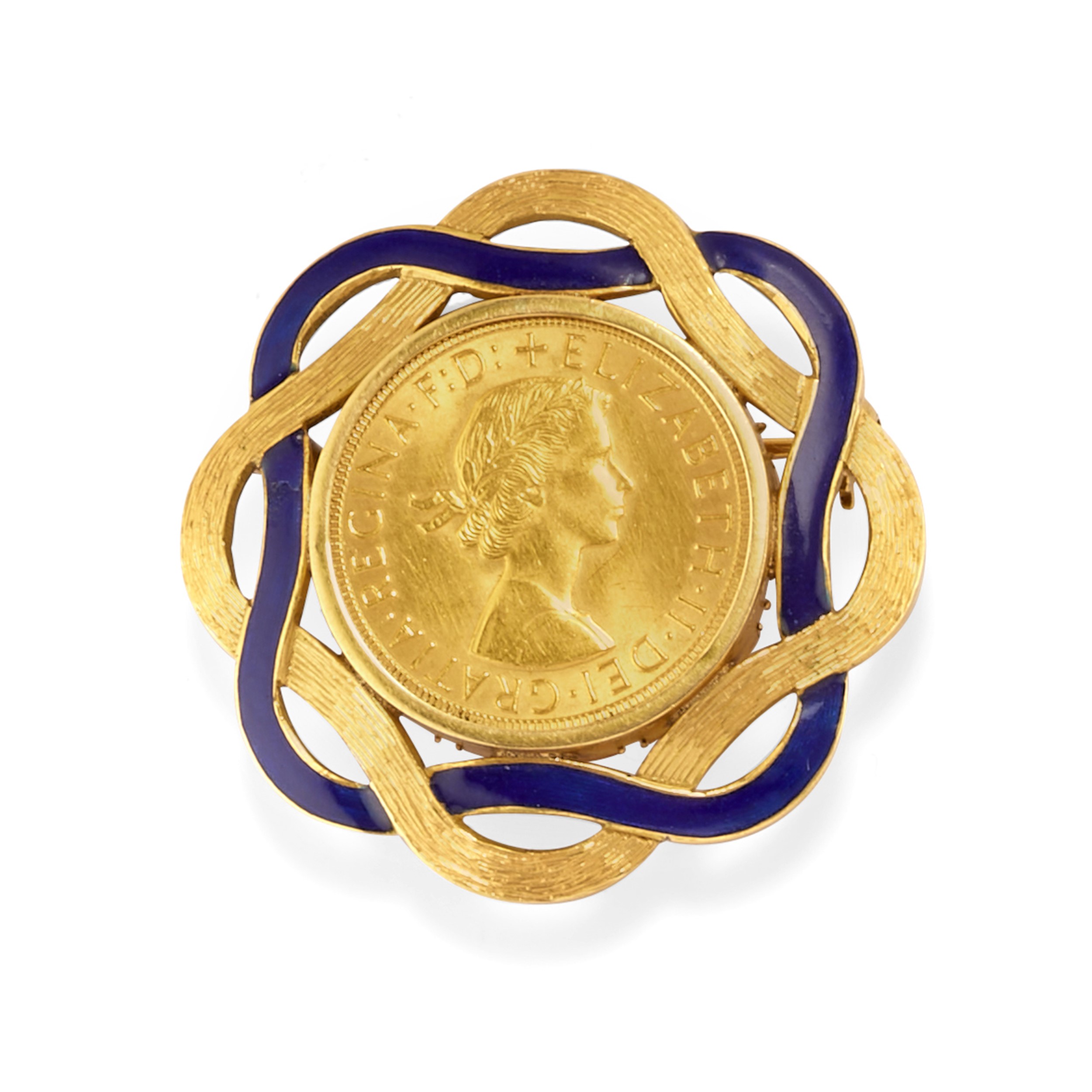 una spilla con decoro in smalto blu e sterlina inglese (g 7,31 di oro puro), una spilla con marengo francese (g 5,80 di oro puro) e una catena (9k) con pendente trattenente dieci franchi francesi (g 2,90 di oro puro).