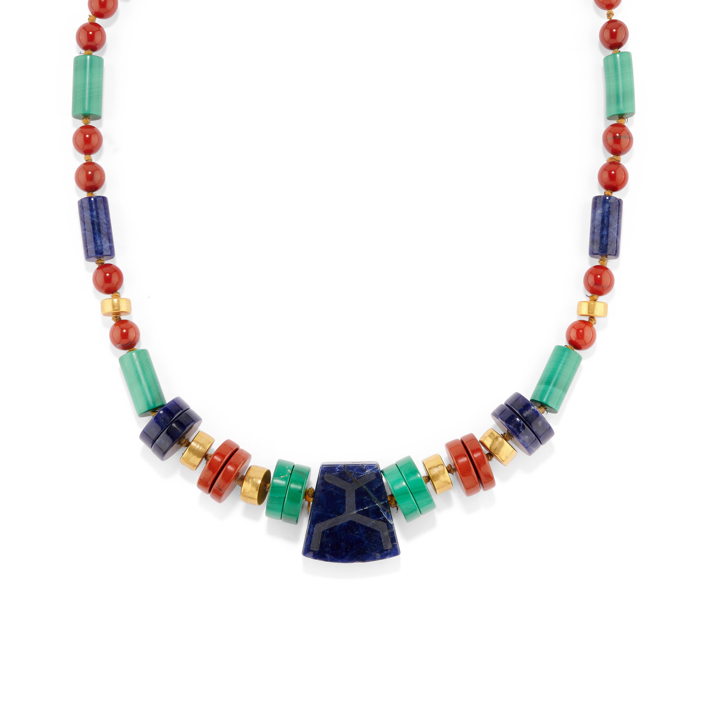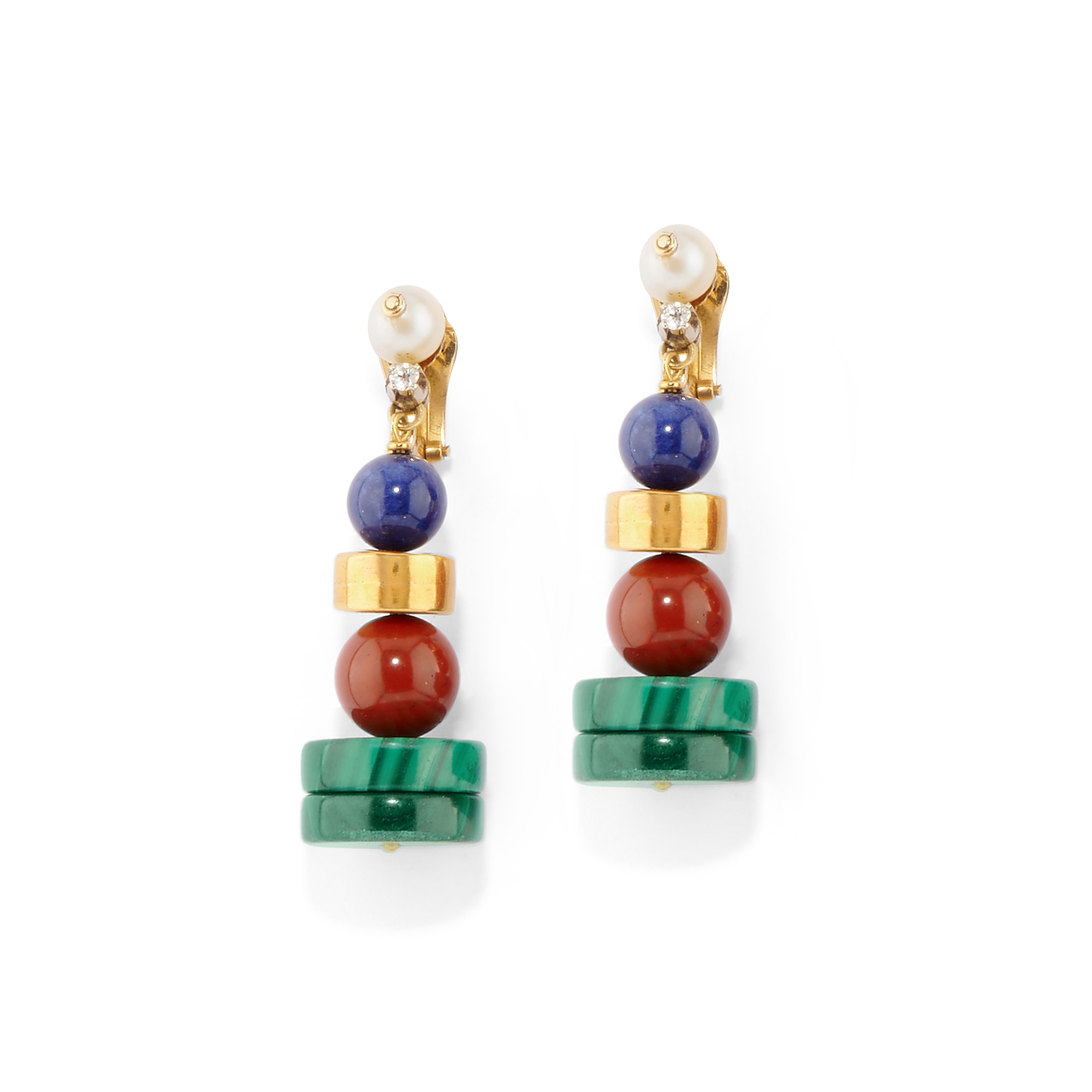 in oro giallo 18ka settori geometrici in pietre dure, perle coltivate e piccoli diamanti, composta da collana e coppia di orecchini con chiusura a clip, difetti (visibili rotture).