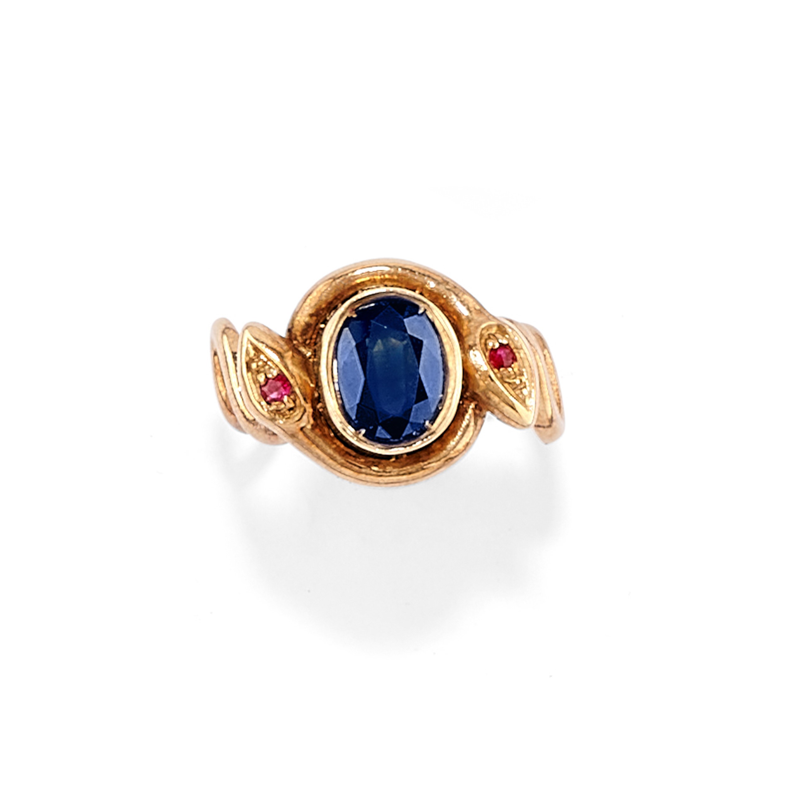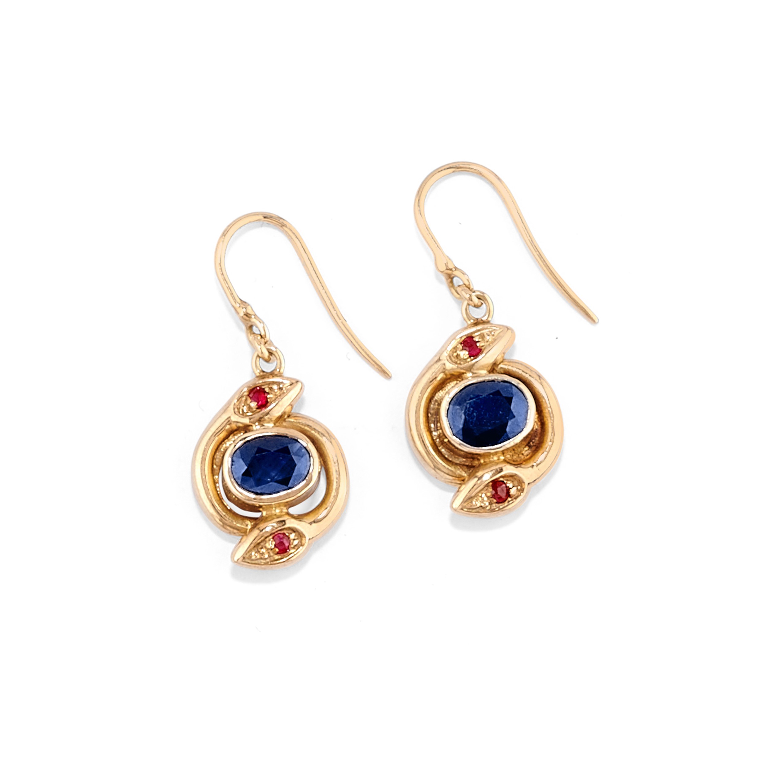 motivi a serpente con al centro zaffiri taglio ovale per totale ct 3,00 circa e piccoli rubini taglio rotondo a decoro, composta da coppia di orecchini con chiusura a monachella e anello.