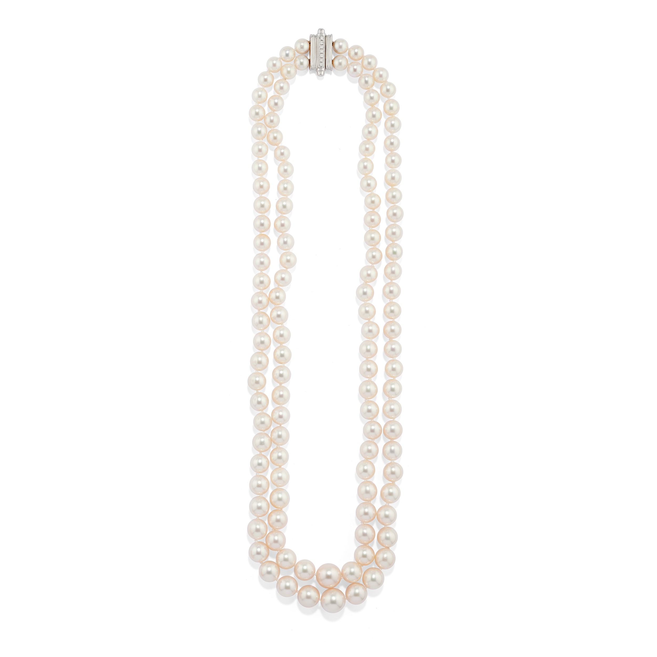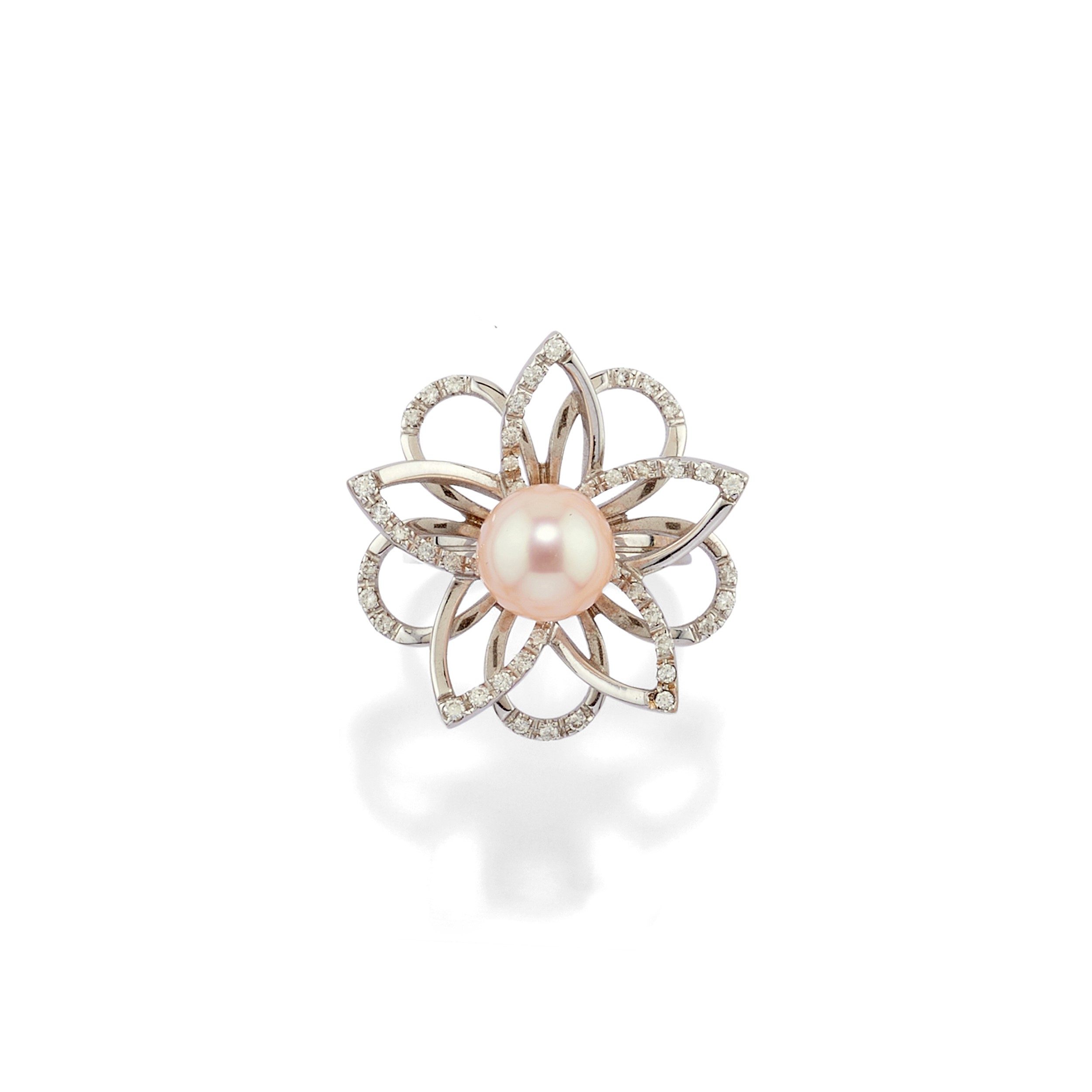 in oro bianco 18kcollana a due fili di perle disposte a dégradée dal centro di mm 10,00/6,50 circa e anello con motivo a fiore con perla di mm 9,50 circa e diamanti taglio brillante.