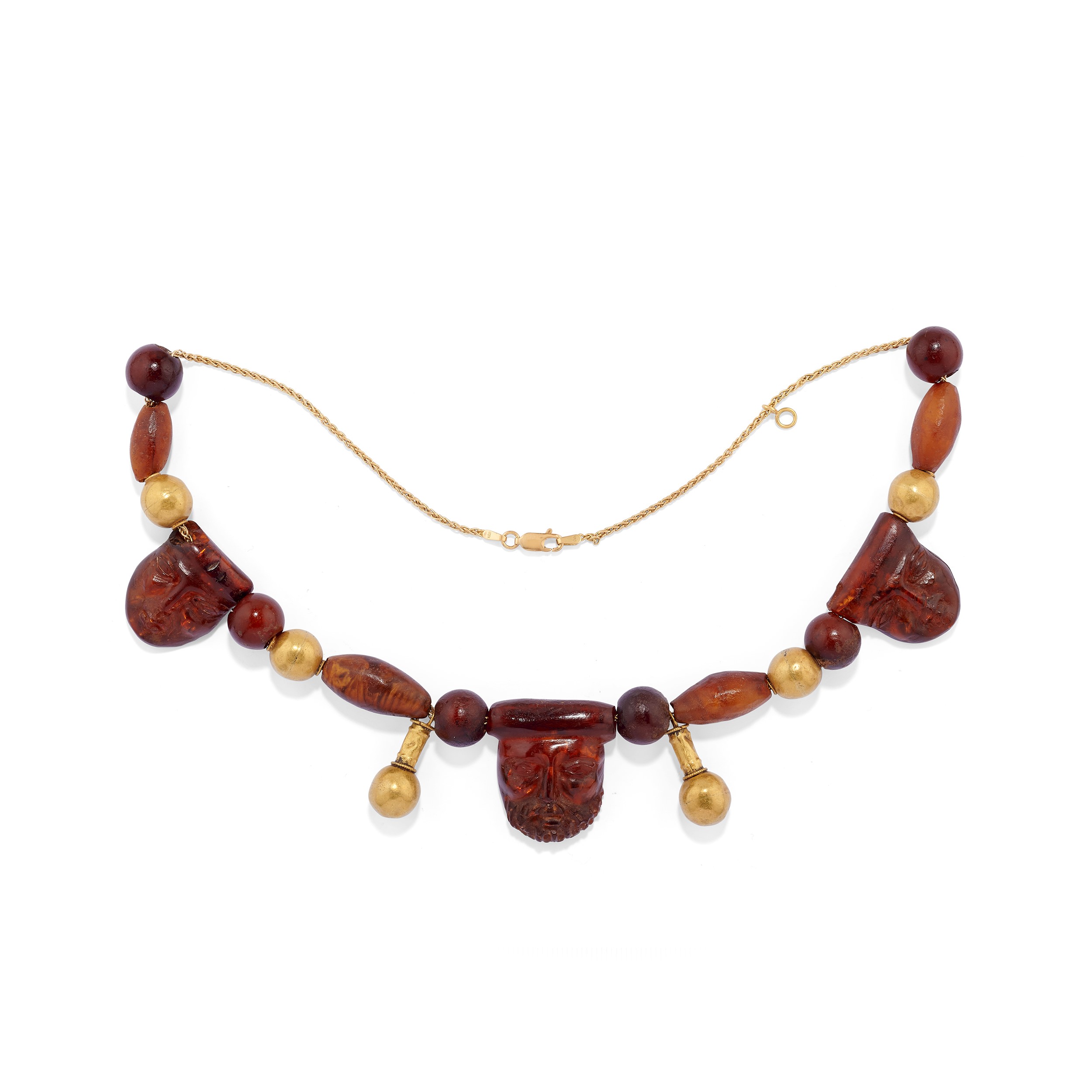 collana realizzata con maschere in ambra e orecchini con ambra ovale cabochon, chiusura a perno e clip.