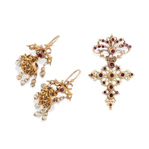 in oro giallo 18kcoppia di orecchini pendenti con perle (prob. naturali), pietre rosse, smalti e chiusura a monachella, e pendente a motivo traforato decorato da granati.