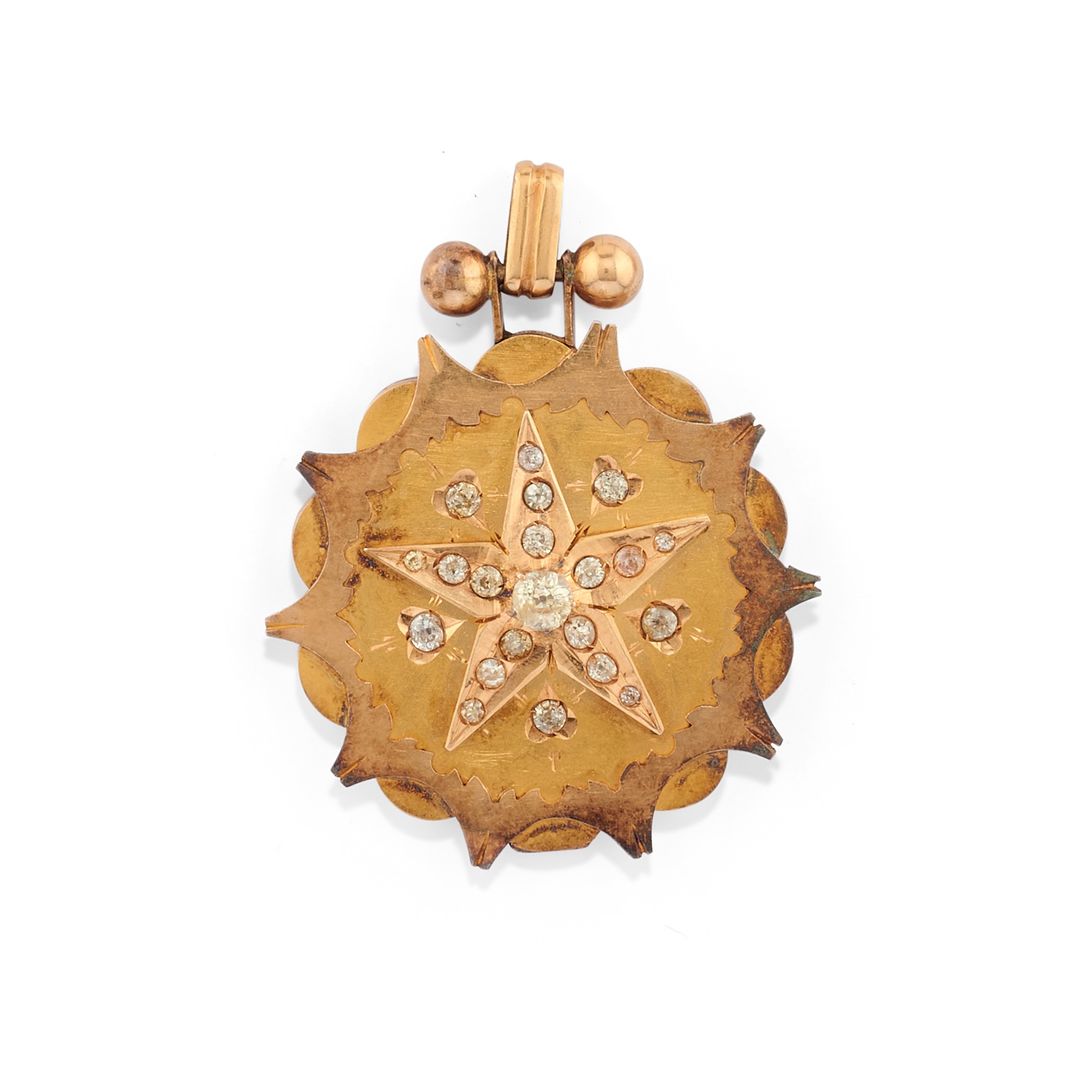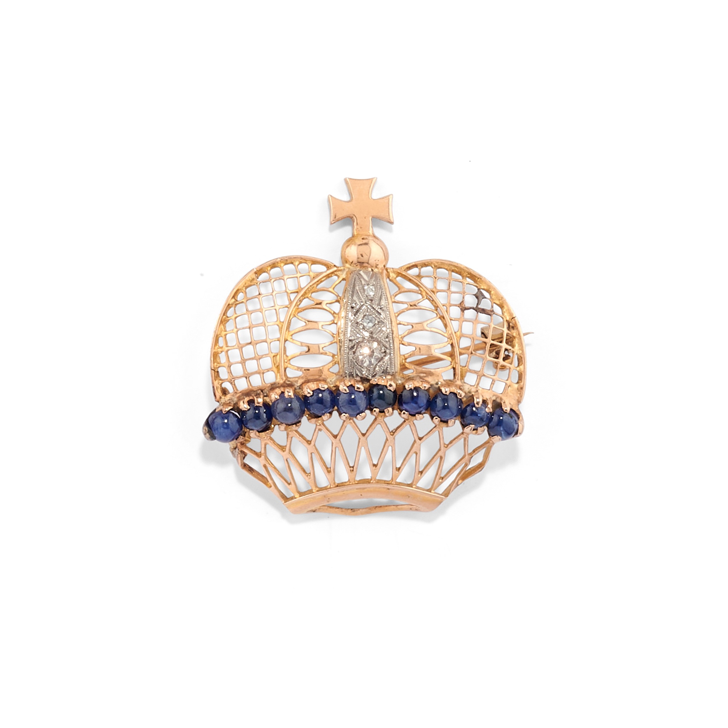 in oro giallo 9k e 18kcomposto da spilla raffigurante corona con zaffiri taglio rotondo cabochon e piccoli diamanti, spillone raffigurante corona e pendente porta fotografie apribile raffigurante stella con motivo centrale decorato da diamanti taglio vecchio.