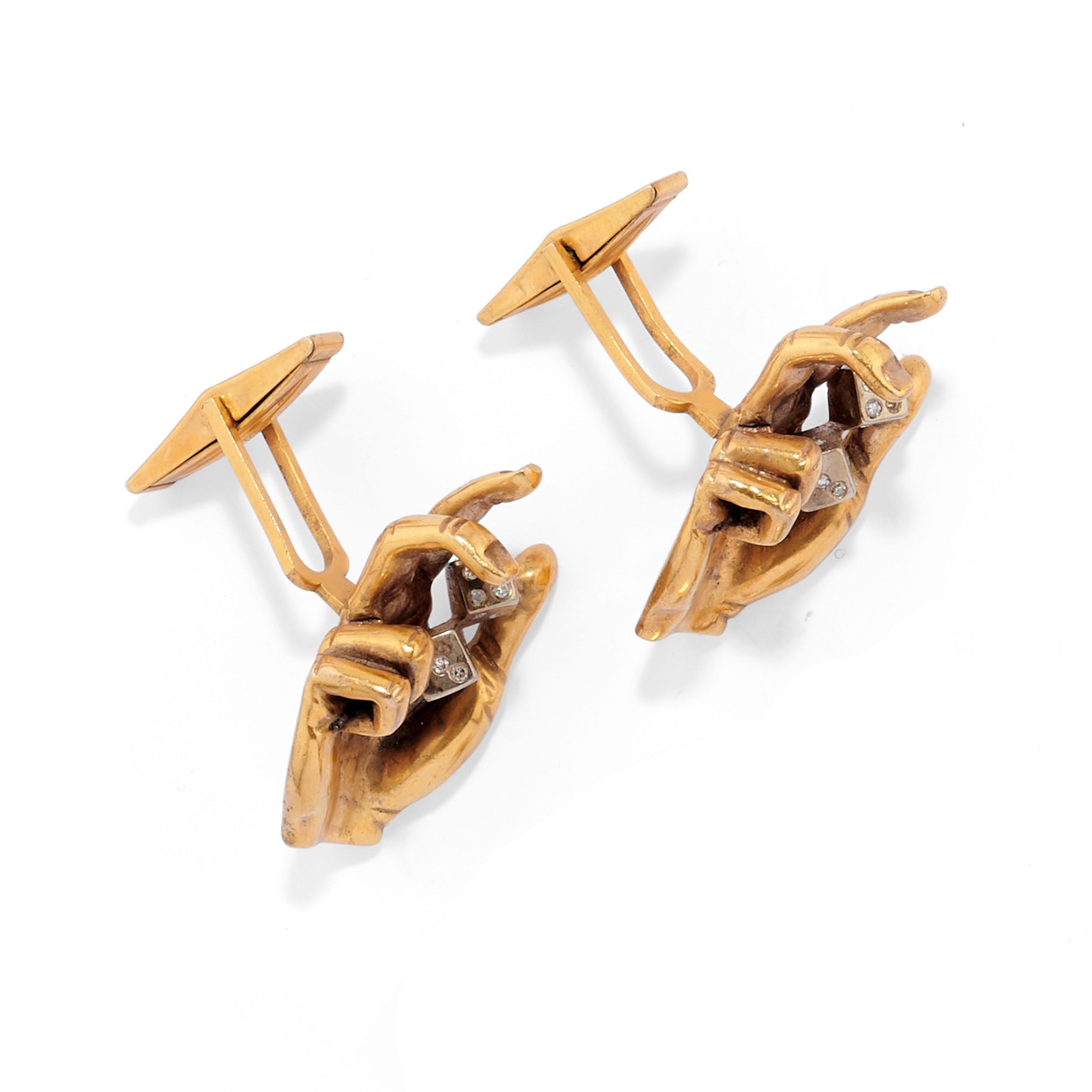 in oro giallo 14kcomposto da coppia di polsini con mani che lanciano dadi e due bottoni a foggia di dado con diamanti taglio brillante.