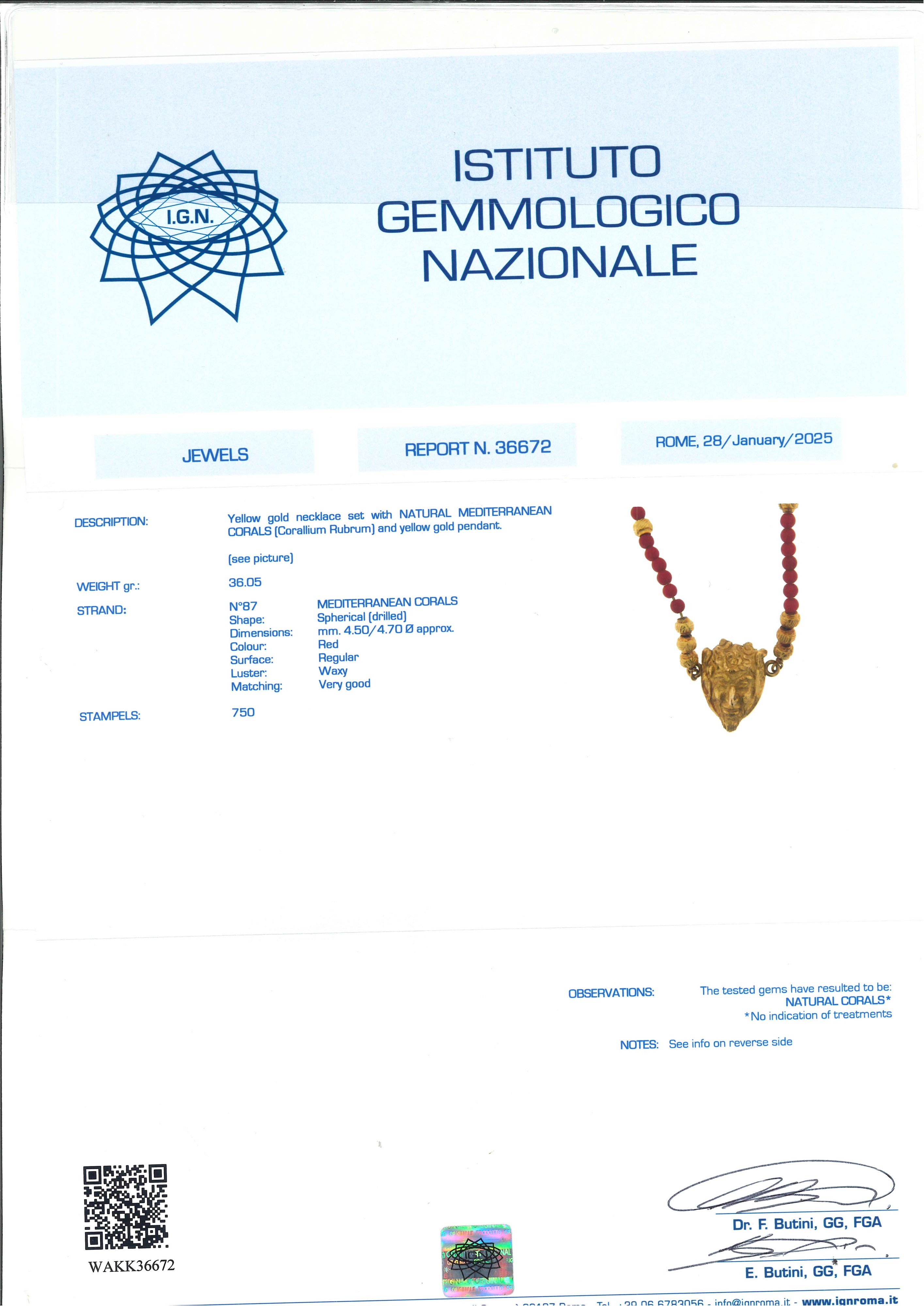 in oro giallo 18krealizzata a un filo semirigido di boule di corallo rosso di mm 4,50/5,00 circa con medaglione centrale raffigurante testa di satiro.